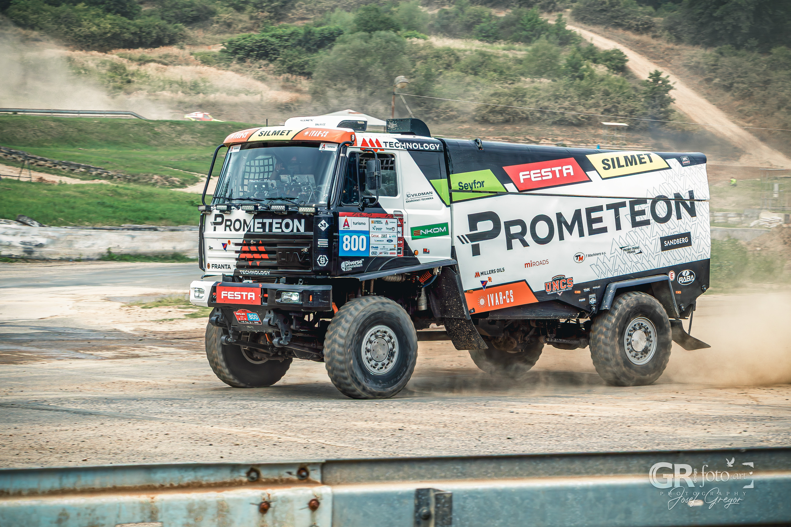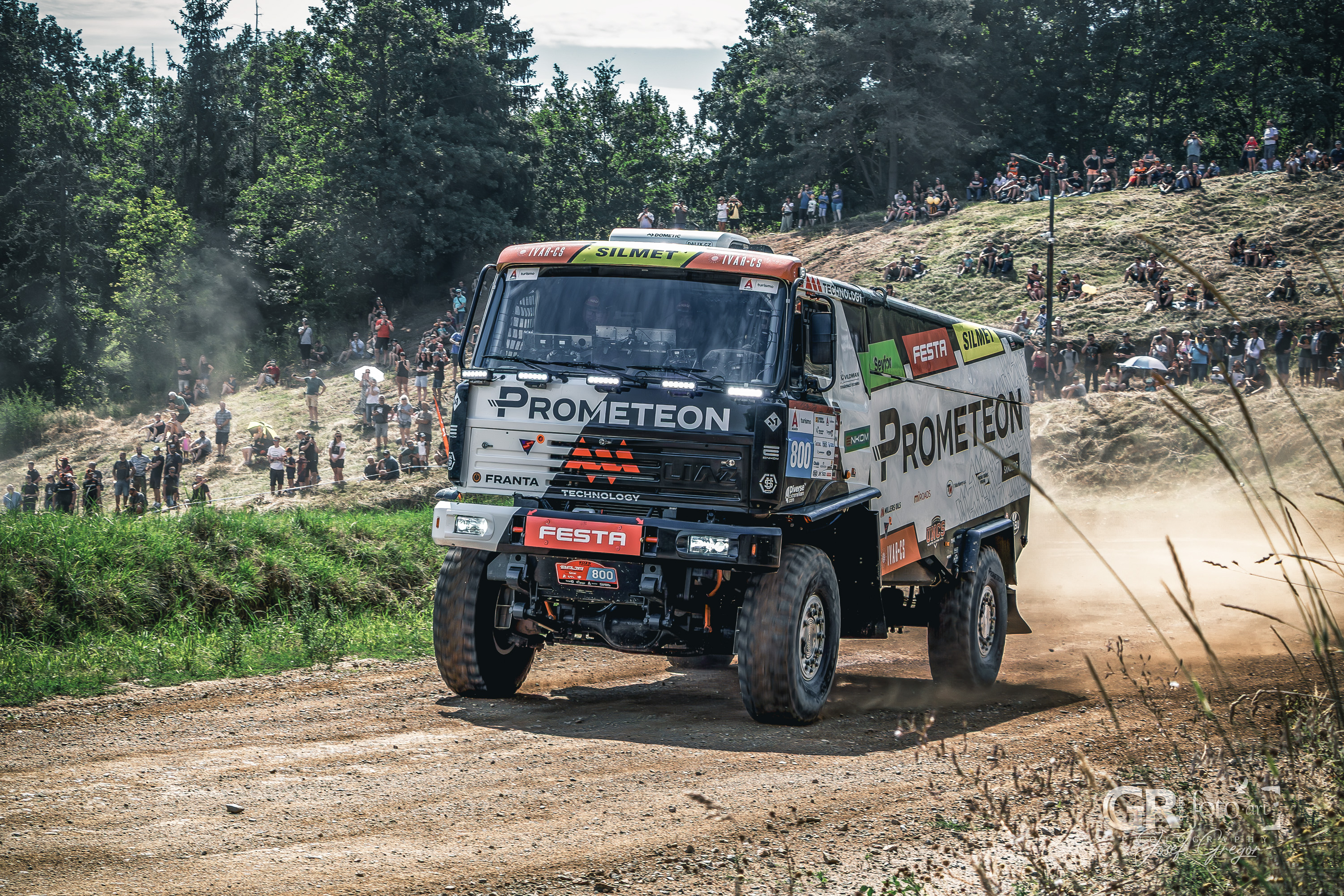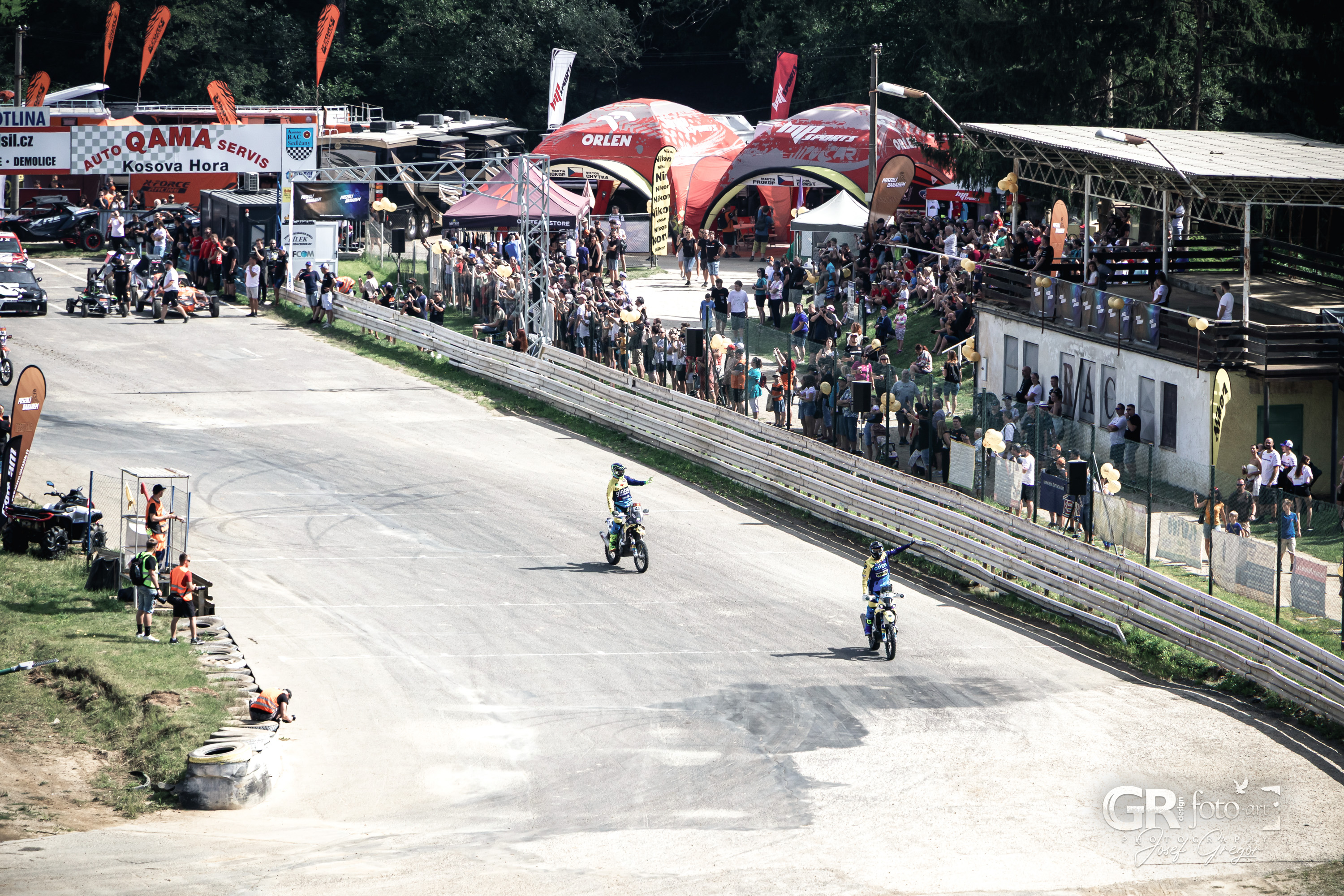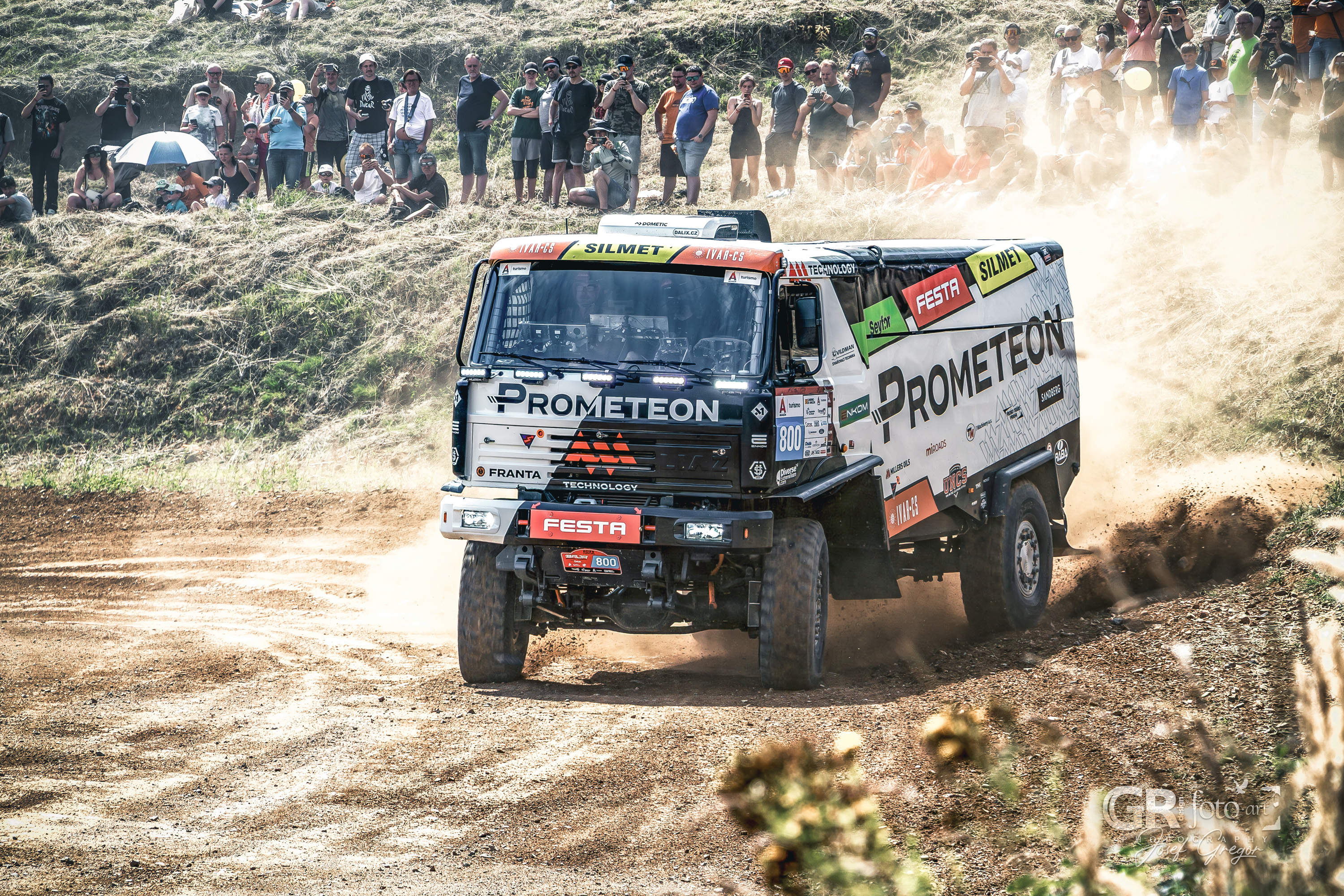 Program se jel prakticky celé odpoledne, s jen krátkými pauzami. Závodníci se střídali na trati, zatímco mimo ni probíhaly rozhovory a besedy. Stání ve frontě na občerstvení tak bylo obohaceno probíhajícím programem. Pro fotografy ale letošní ročník znamenal i pořádnou výzvu. Slunečné počasí, sucho a horko proměnily autokrosovou dráhu v prašnou arénu, kde stačilo jedno projíždějící auto a člověk dostal „denní dávku“ prachu. Fotky před postprodukcí vypadaly téměř nepoužitelné, ale s trochou práce se většina dala zachránit. Horší to bylo s technikou – můj Canon R10 s objektivem 18–135 mm není prachotěsný, takže při průjezdech jsem musel opatrně zoomovat a neustále čistit tubus objektivu. Naštěstí se zdá, že se prach dovnitř nedostal. Problémy občas nastaly i při ostření přes hustý prach, ale na důležité momenty Canon obstál se ctí.