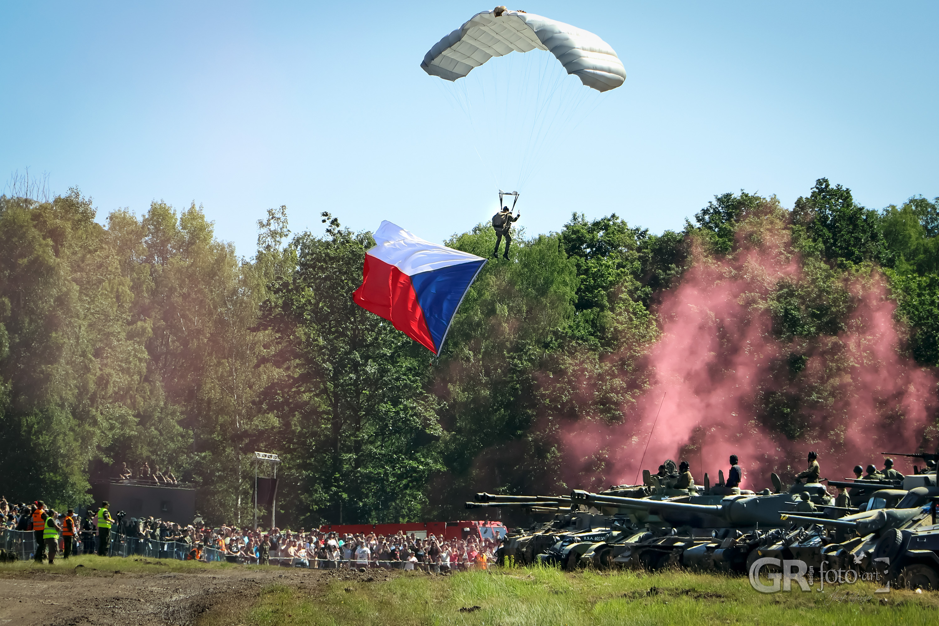 Ale ruku na srdce, nikdo nepřijel poslouchat řeči politiků. Před samotným zahájením přeletěly dva letouny L-159 Alca. Nejsou tak hlasité jako Gripeny, ale i tak krásně burácely oblohou. Následoval seskok výsadkářů s vlajkami ČR, NATO, výsadkového pluku a ještě několika dalšími, které už z dálky nebylo možné rozeznat. Během toho pořád mluvili hosté, ale lidi už jen napjatě čekali na opravdový start — salvou z houfnic DANA. A pak to přišlo. Kdo nikdy neslyšel výstřel z houfnice a není hluchý jak poleno, ten se musí zákonitě leknout. Jasně, můžete si říct: „viděl jsem to v televizi a žádná velká rána to nebyla“, ale naživo spíš dokonale sedí vyjádření v ostravském hantecu: „jeba jak cyp“. A to ještě není všechno. Nejen že se leknete jak blázen, ale ještě to ucítíte. Rázová vlna po vás přejede jak tramvaj a zem se otřese. K mému překvapení se mi povedlo zachytit nejen samotný výstřel, ale i tu rázovou vlnu na fotce.