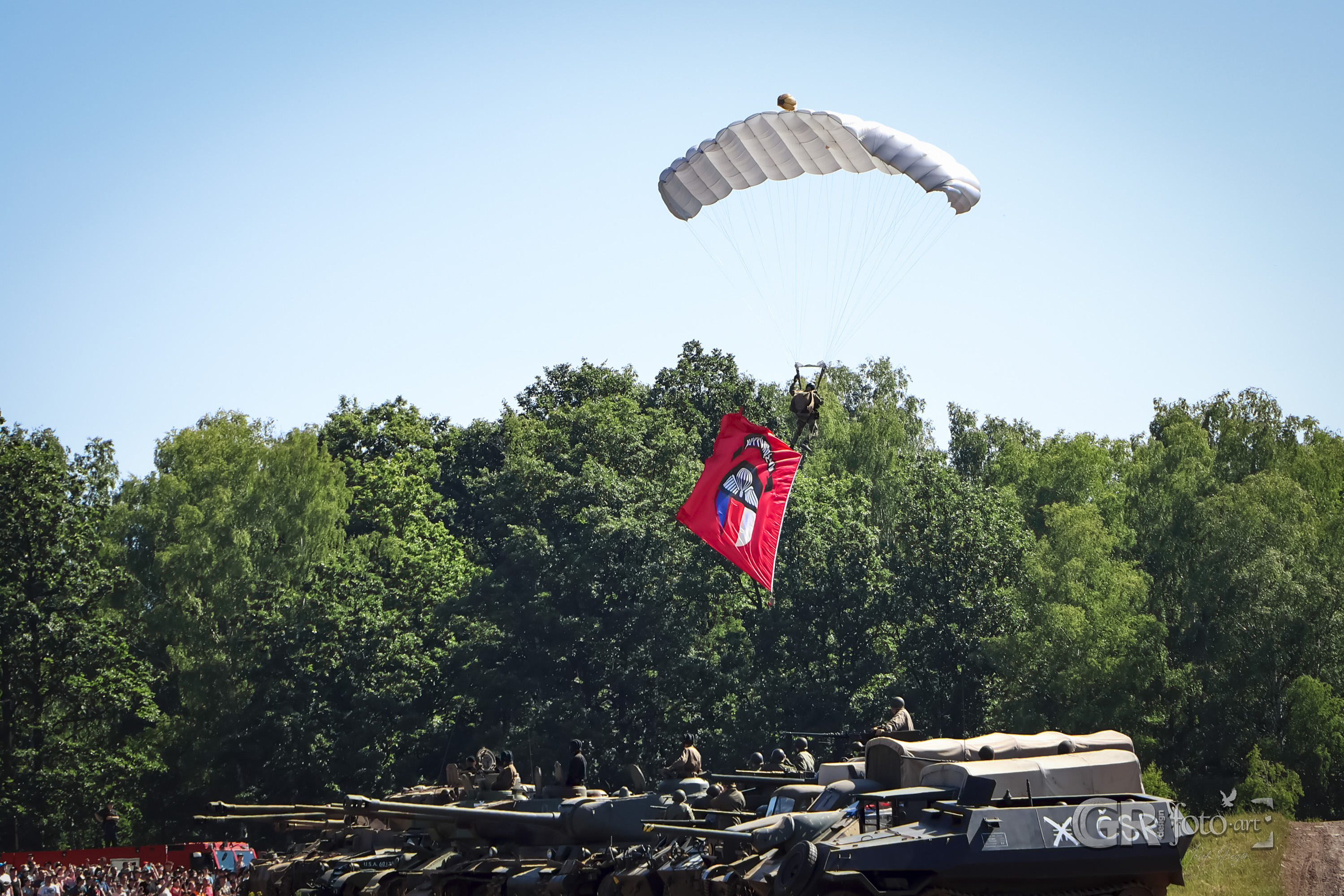 Po celý den probíhaly další přehlídky — třeba ukázky práce policejního psa nebo rekonstrukce bitev z druhé světové války. Strojů bylo dost a to nejen německé a sovětské výroby, ale i americké. Nechyběla ani dobová výstroj. Pozemní bitvu pak doplnil letecký útok. Zkrátka pořád bylo na co koukat. Organizace šlapala jak hodinky. Bez vstupného se ale těžko odhaduje návštěvnost, ale odhadem to byly tisíce lidí. Kolem poledne se už skoro nedalo procházet a pokud jste nechtěli někomu šlapat po hlavě, focení bylo docela o nervy. Mezi lidmi se pohybovali organizátoři, vojenská i civilní policie se samopaly. No není se co divit, takové akce můžou přitahovat různá individua. Možná i proto, že byla přítomná špička obrany. Kromě ministryně obrany i armádní velitelé a generálové. Po poledni se mezi davem najednou objevil i prezident. Obklopen ochrankou, která působila dost paranoidně, jak neustále sledovala okolí. Ale dává to smysl. Jen mě zajímalo, jak se na Bahna vůbec dostal? Viděl jsem jen, že přišel odspodu areálu. Anebo přiletěl? Protože na heliportech se mezitím objevil další vrtulník a ty jsou právě v dolní části. No, možná...
