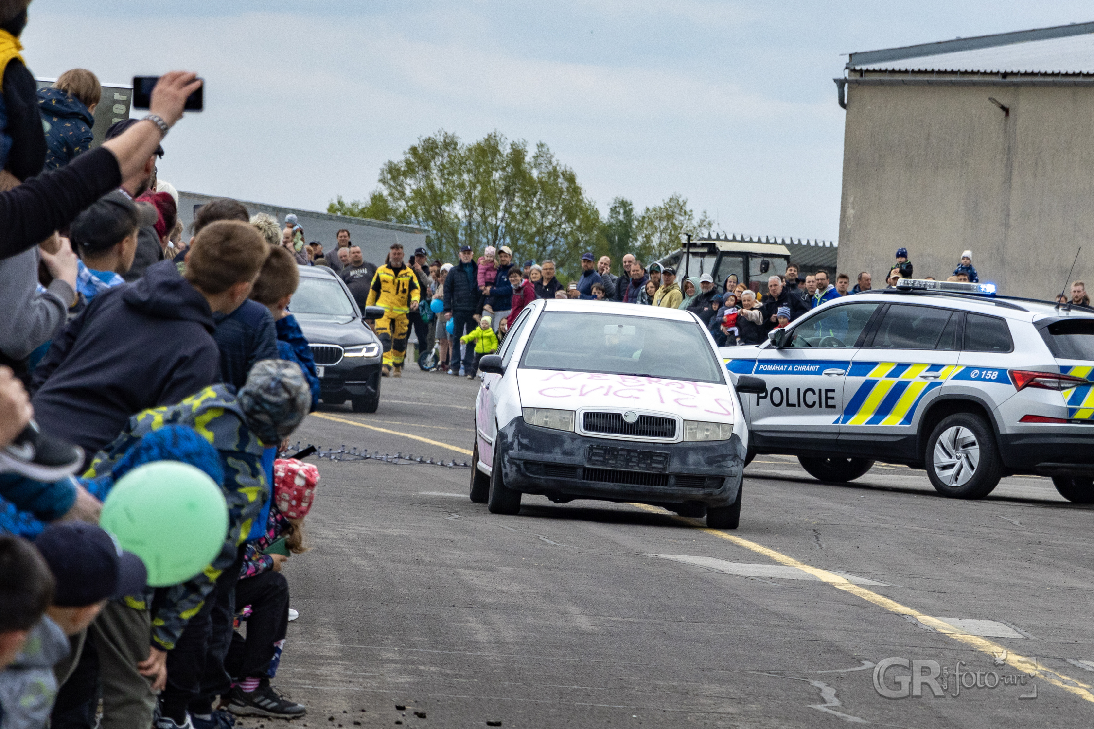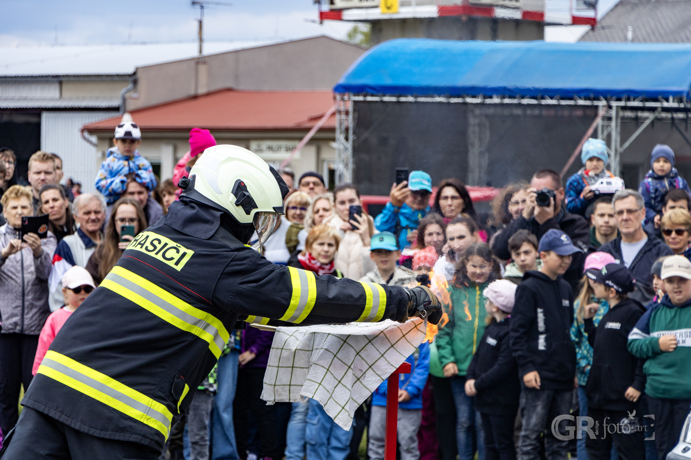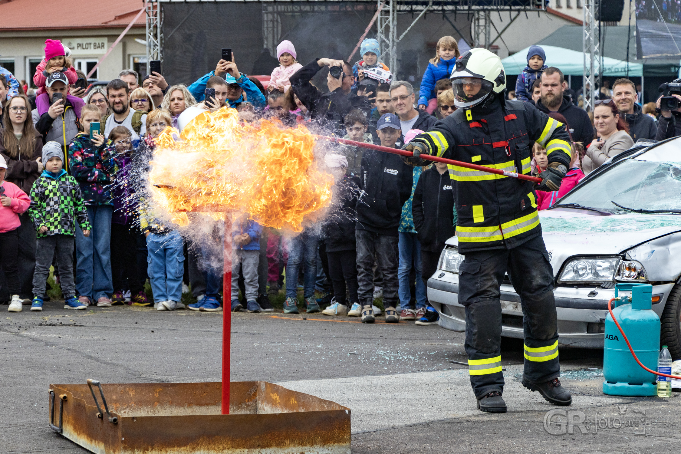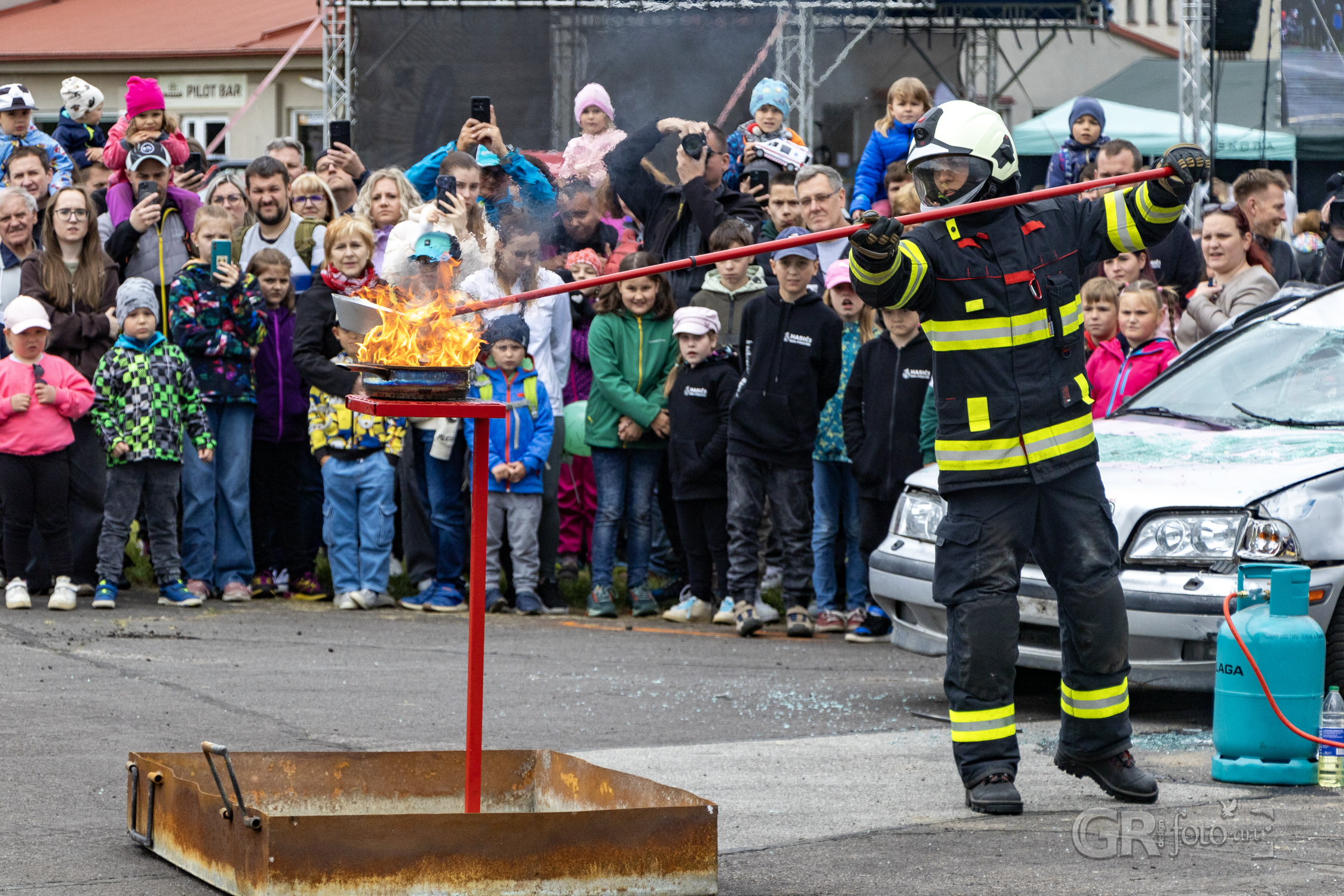 Po zásahu se pozornost přesunula ke zbývajícímu autu – převrácení na kola, naložení na vůz. Rutina, která ukončila jednu kapitolu dne. Na stejném místě už se ale připravovala další ukázka – hašení hořícího oleje. Hasiči názorně ukázali, co (ne) dělat, když v kuchyni vzplane pánev. Jaký je rozdíl mezi přikrytím utěrkou, použití kuchyňského plechu a použitím vody? Ten třetí scénář přišel nakonec – a plameny vybuchly do výšky v dramatickém výjevu, který si diváci jistě zapamatují.