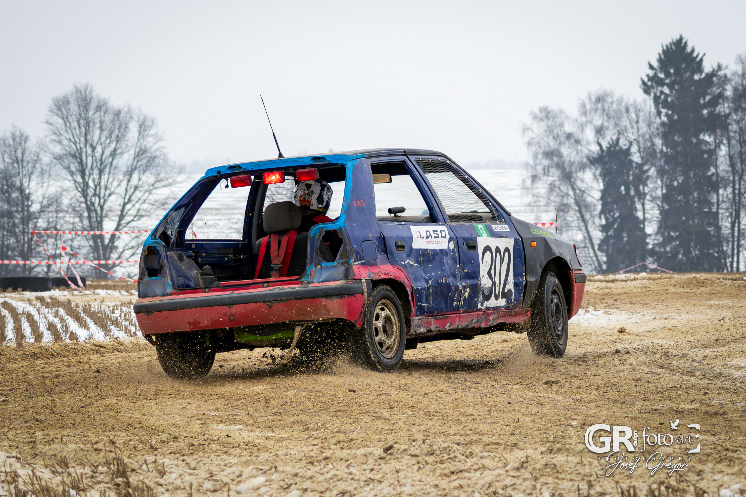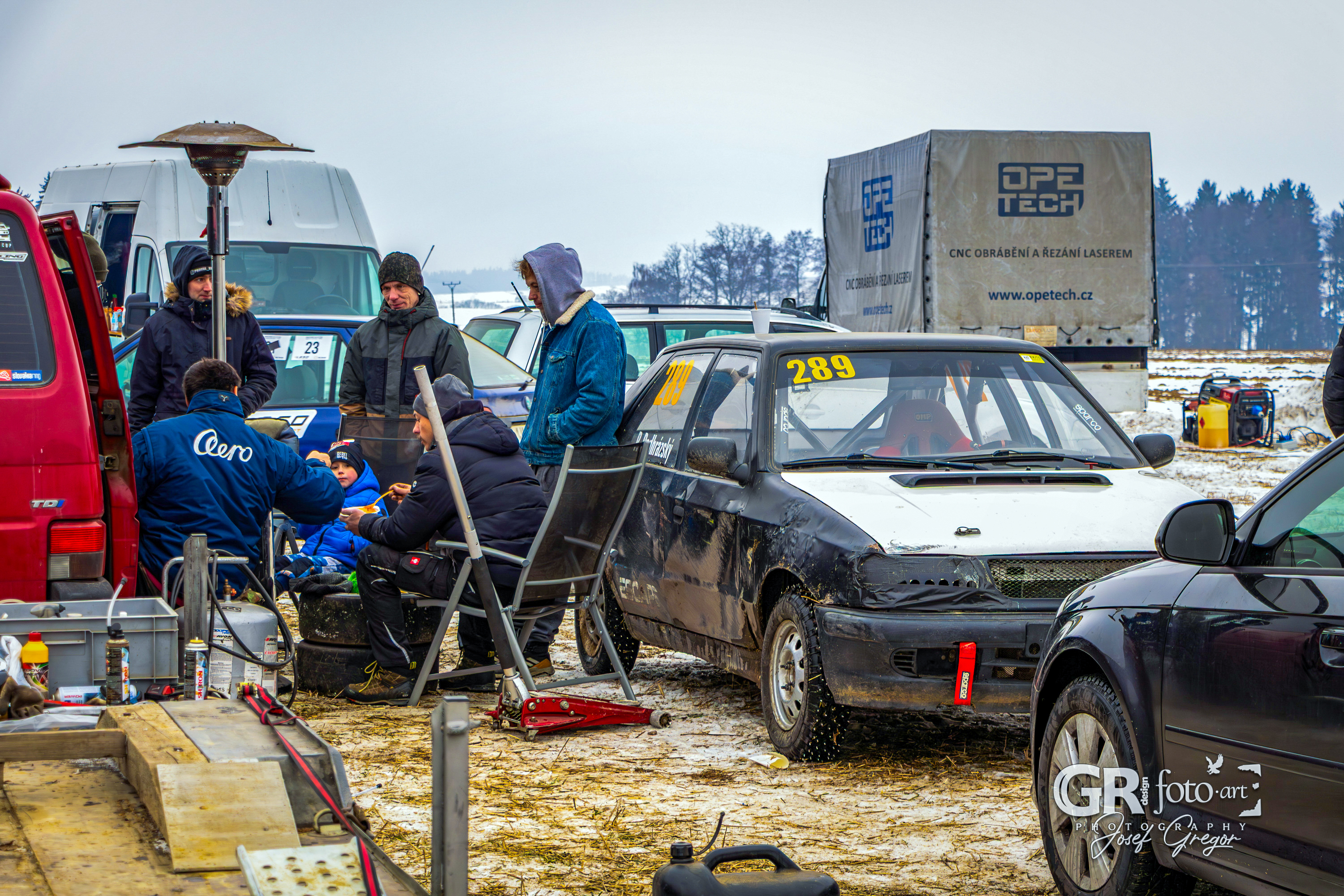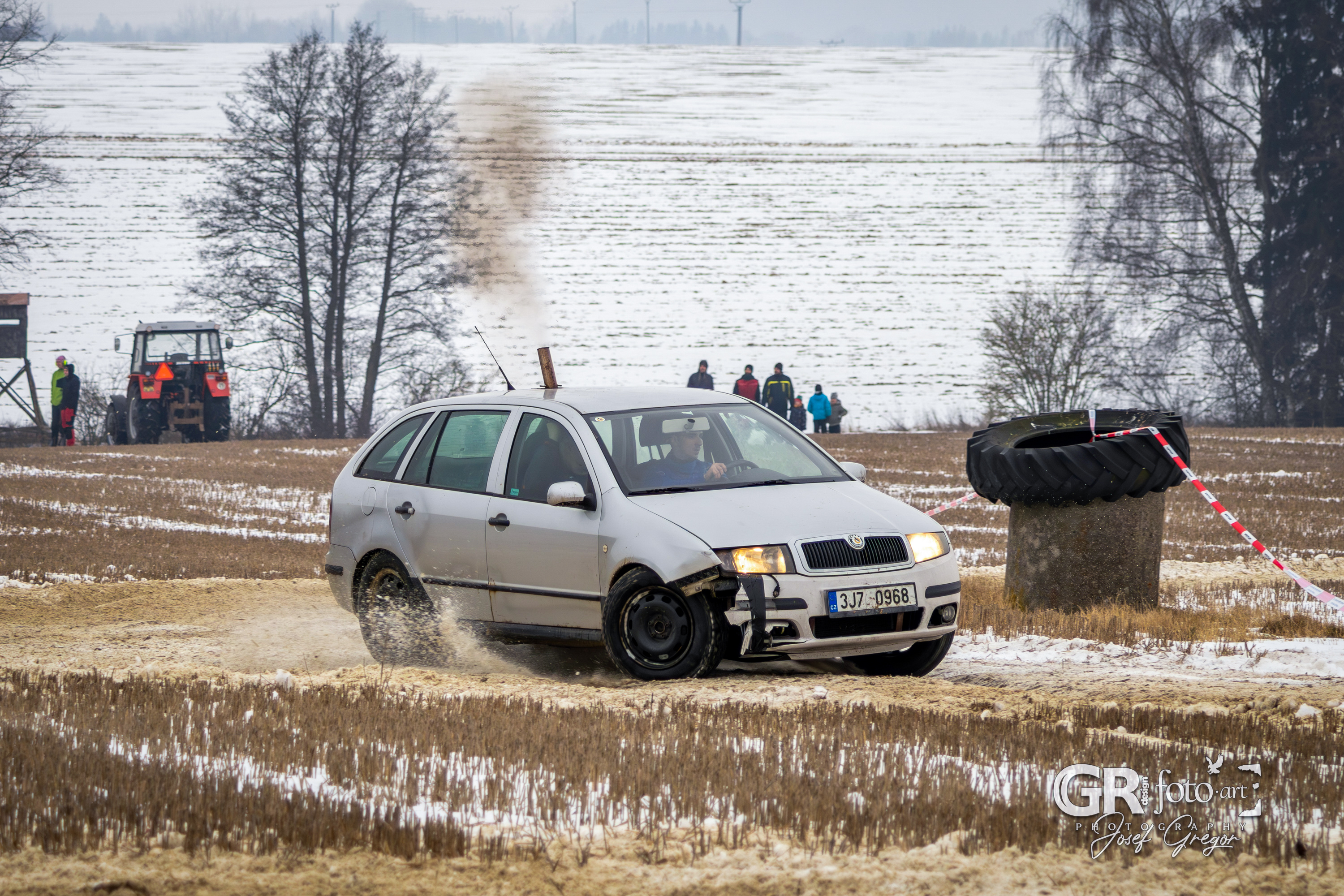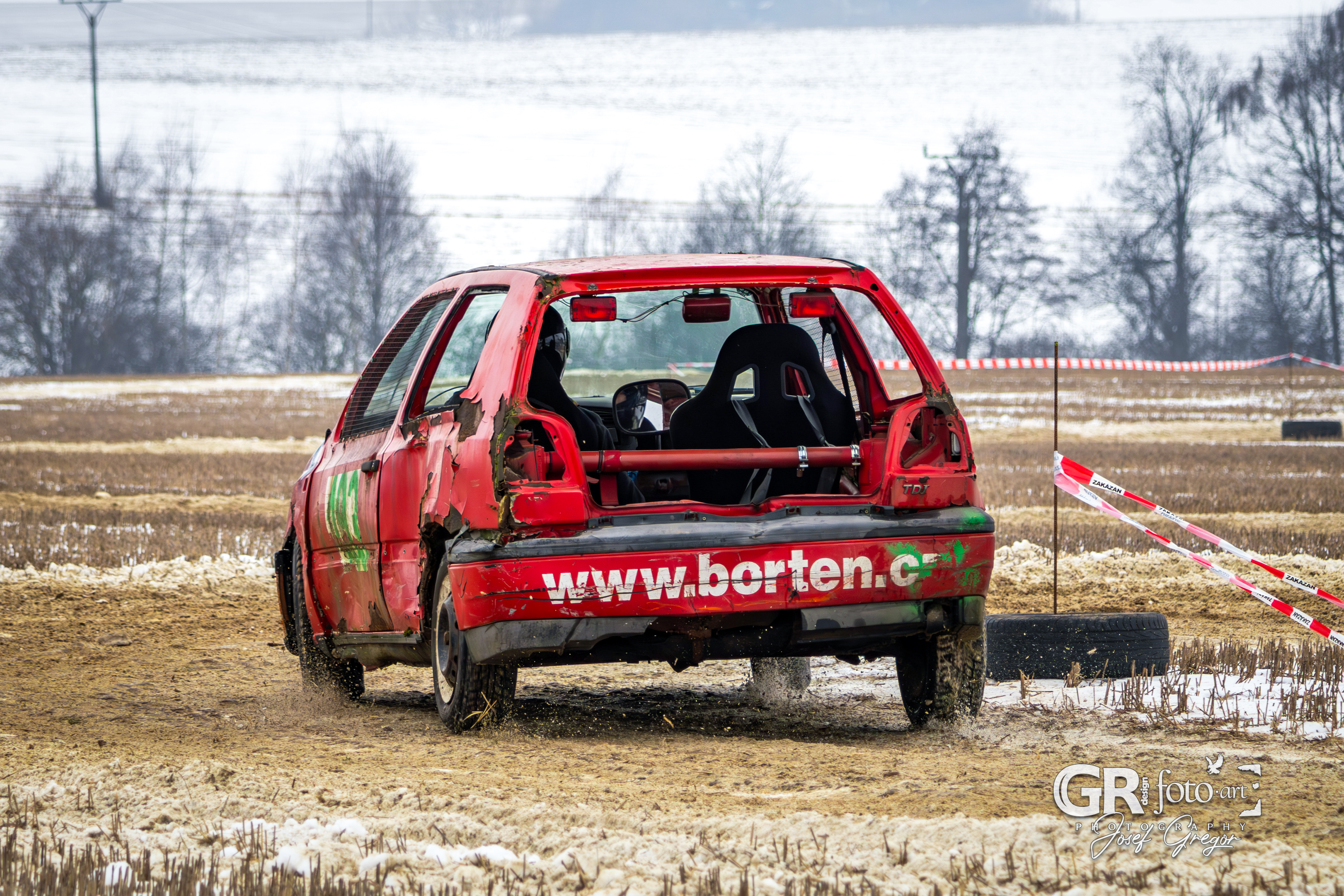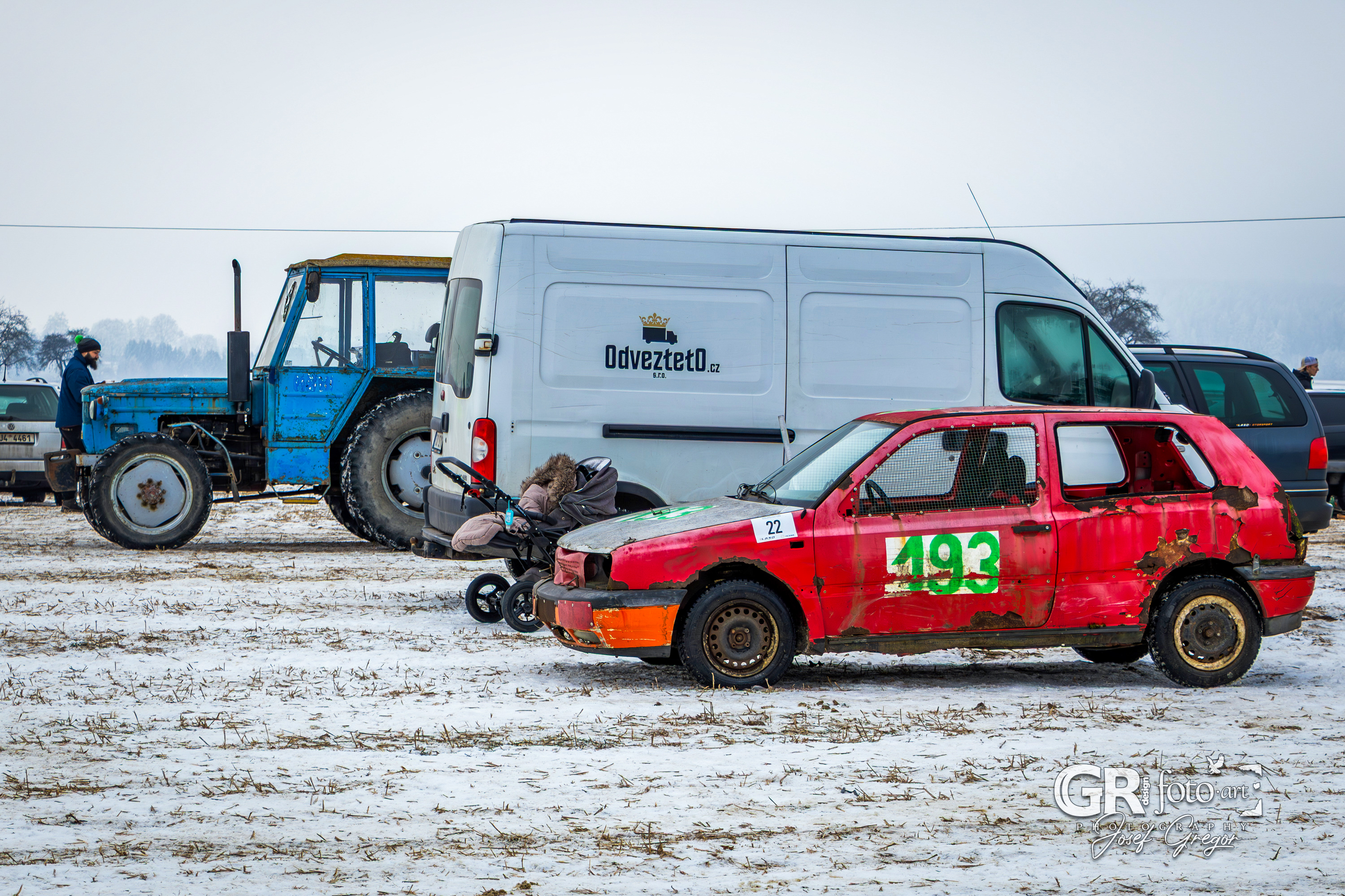 První měřené rozjížďky začaly kolem půl desáté, kdy bylo startovní pole ještě plné. Jenže co by člověk nechtěl – zrovna v sobotu, kdy se akce konala, jsem měl službu v práci. Na místo jsem se tak dostal až kolem poledne, což už znamenalo spoustu odpadlých závodníků a výrazně prořídlé startovní pole. Ono se není čemu divit. Akce se konala na nezoraném, ale úplně zmrzlém poli, jen s tenkou vrstvou sněhu. Kameny a hlubší nerovnosti tak způsobovaly brutální likvidaci aut a upřímně se divím, že se někdo odvážil vjet na trať i s vozem, se kterým pak plánoval odjet domů. A trochu mi to spíš připadalo jako bezkontaktní demoliční derby, protože aut stavěných na takový povrch se v závodním poli skutečně moc nenašlo. V každém případě to pro mě bohužel znamenalo fotit už jen zbytky přeživších.