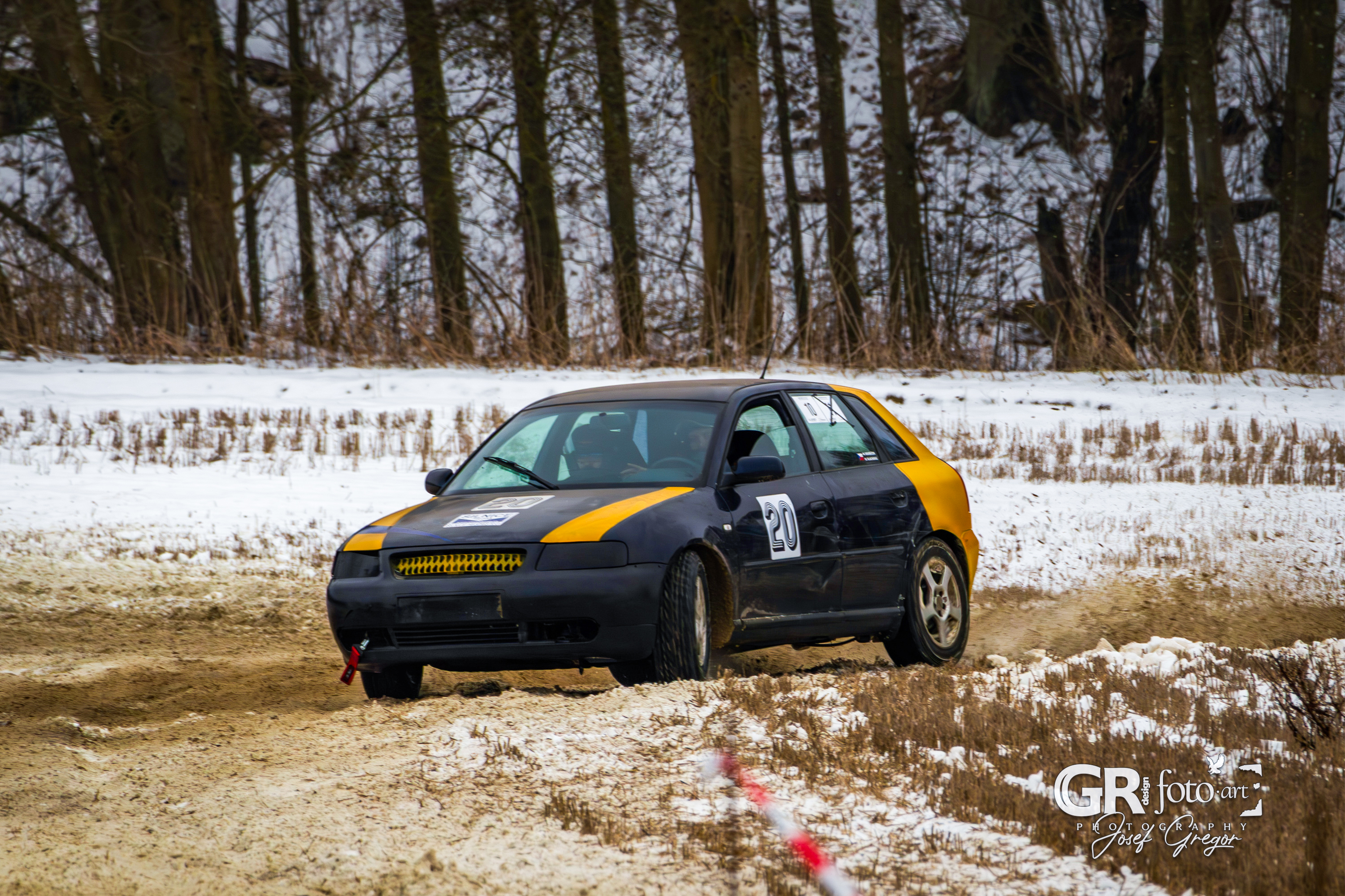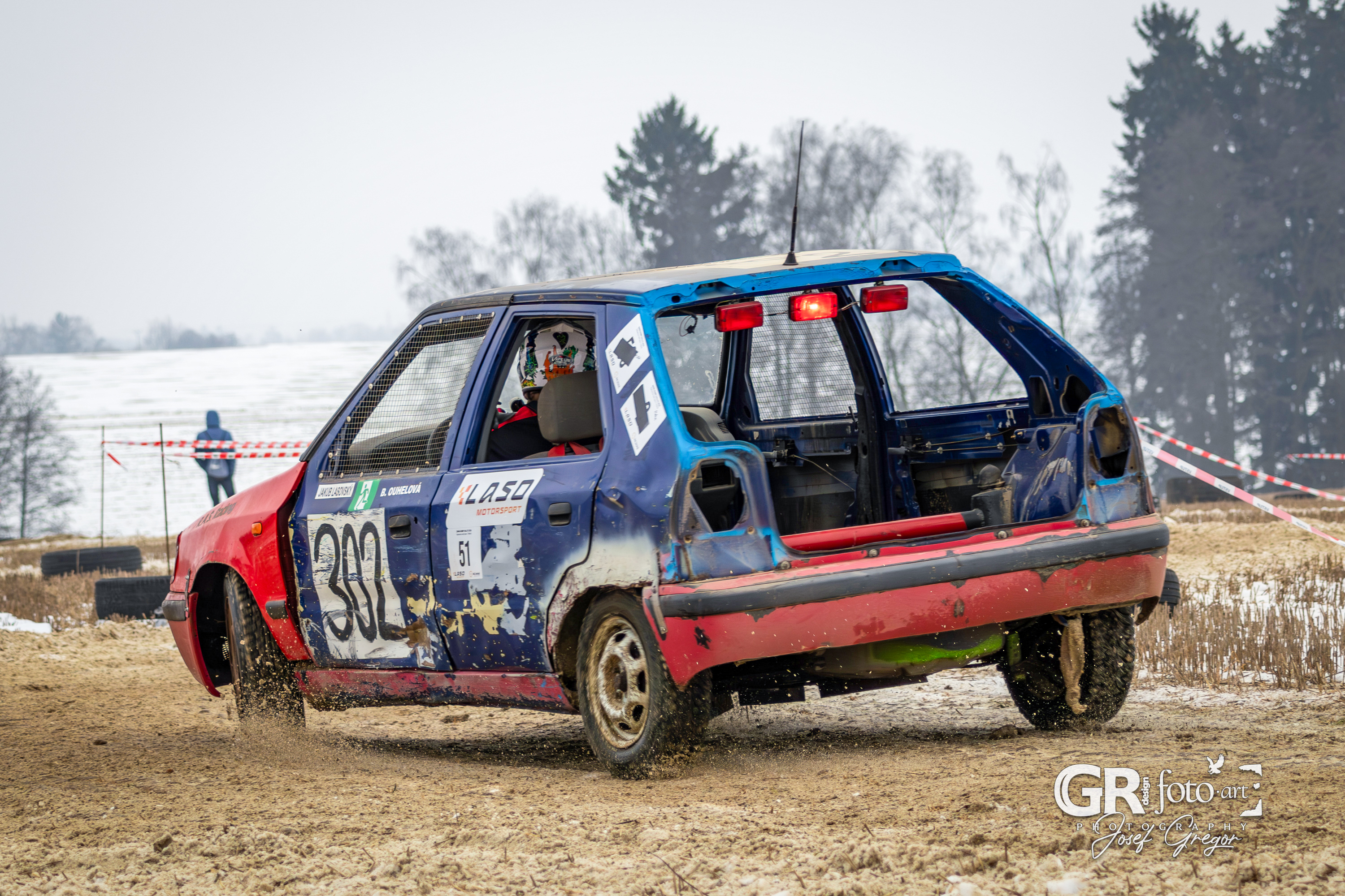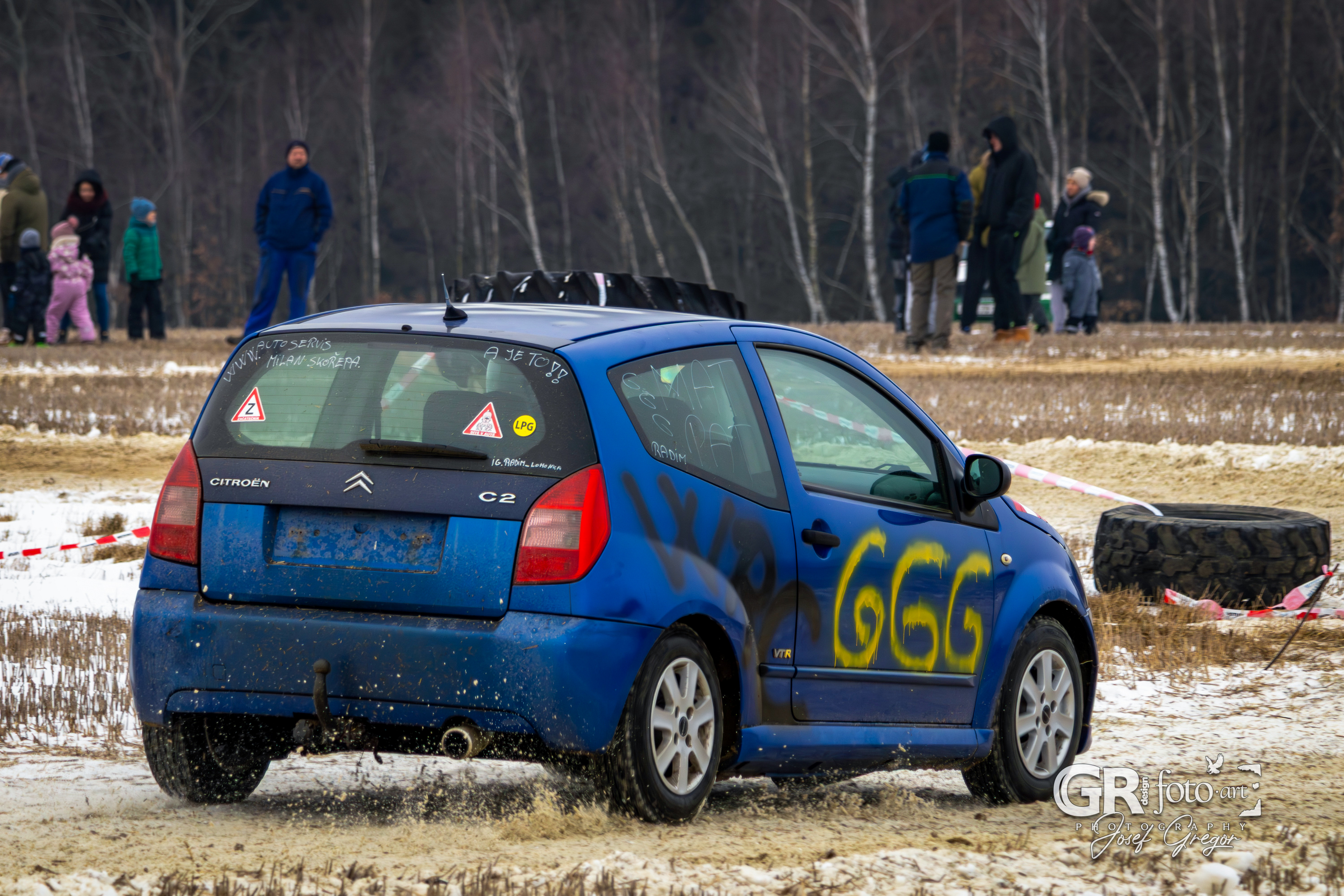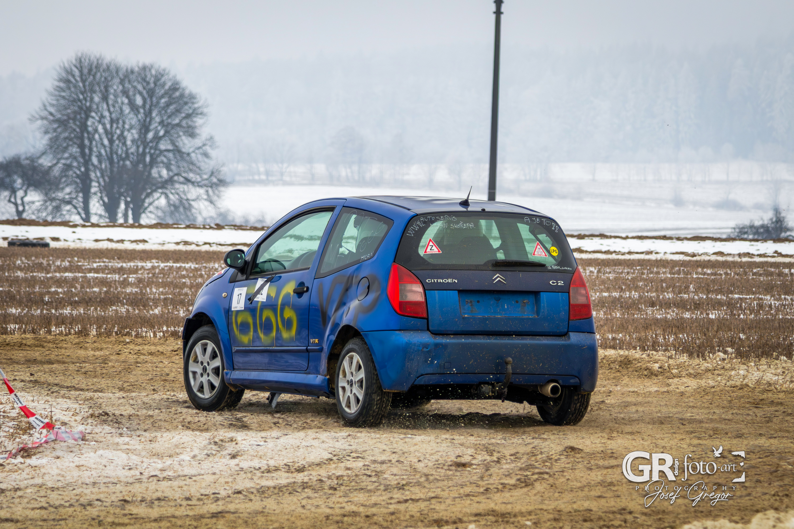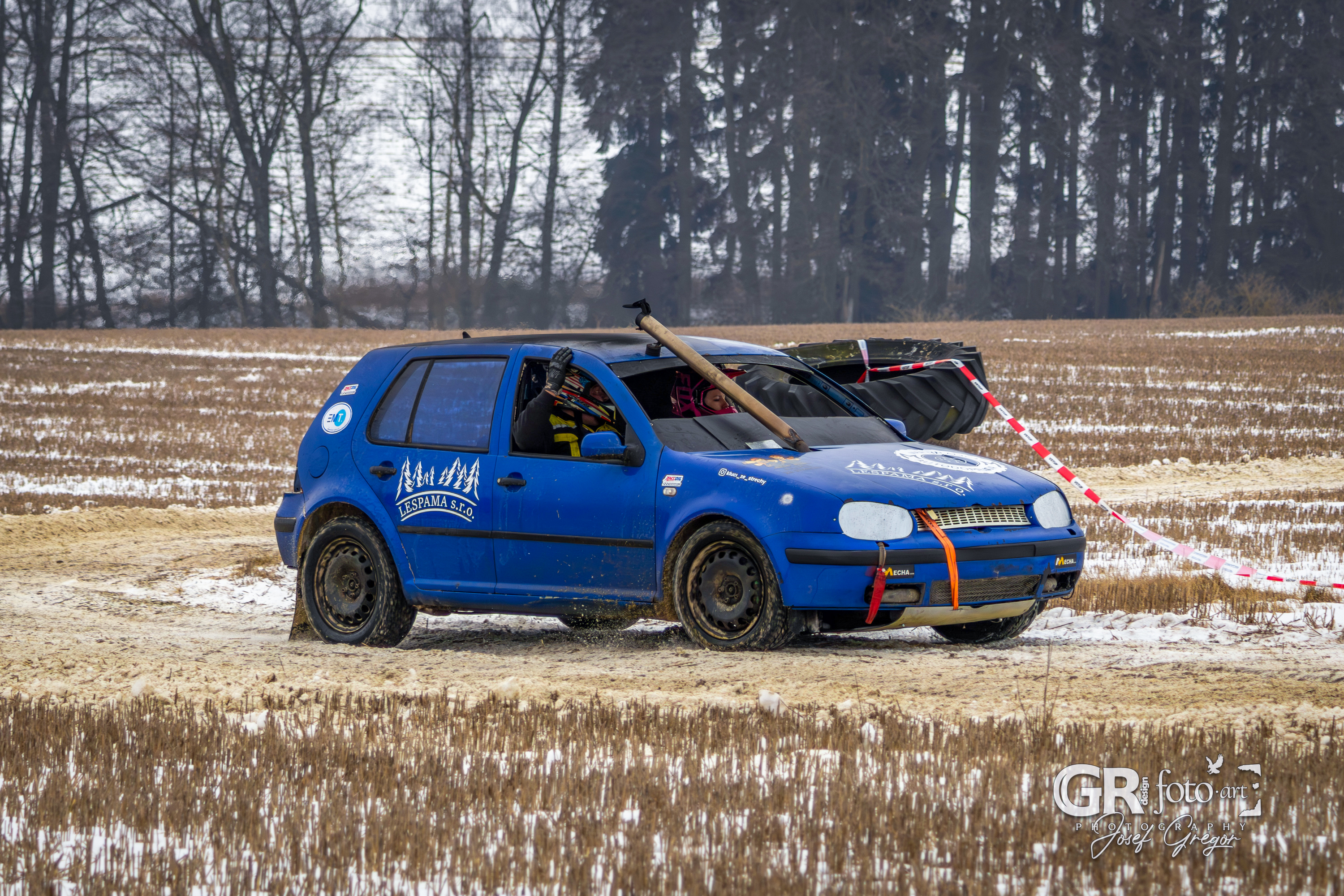 První měřené rozjížďky začaly kolem půl desáté, kdy bylo startovní pole ještě plné. Jenže co by člověk nechtěl – zrovna v sobotu, kdy se akce konala, jsem měl službu v práci. Na místo jsem se tak dostal až kolem poledne, což už znamenalo spoustu odpadlých závodníků a výrazně prořídlé startovní pole. Ono se není čemu divit. Akce se konala na nezoraném, ale úplně zmrzlém poli, jen s tenkou vrstvou sněhu. Kameny a hlubší nerovnosti tak způsobovaly brutální likvidaci aut a upřímně se divím, že se někdo odvážil vjet na trať i s vozem, se kterým pak plánoval odjet domů. A trochu mi to spíš připadalo jako bezkontaktní demoliční derby, protože aut stavěných na takový povrch se v závodním poli skutečně moc nenašlo. V každém případě to pro mě bohužel znamenalo fotit už jen zbytky přeživších.
