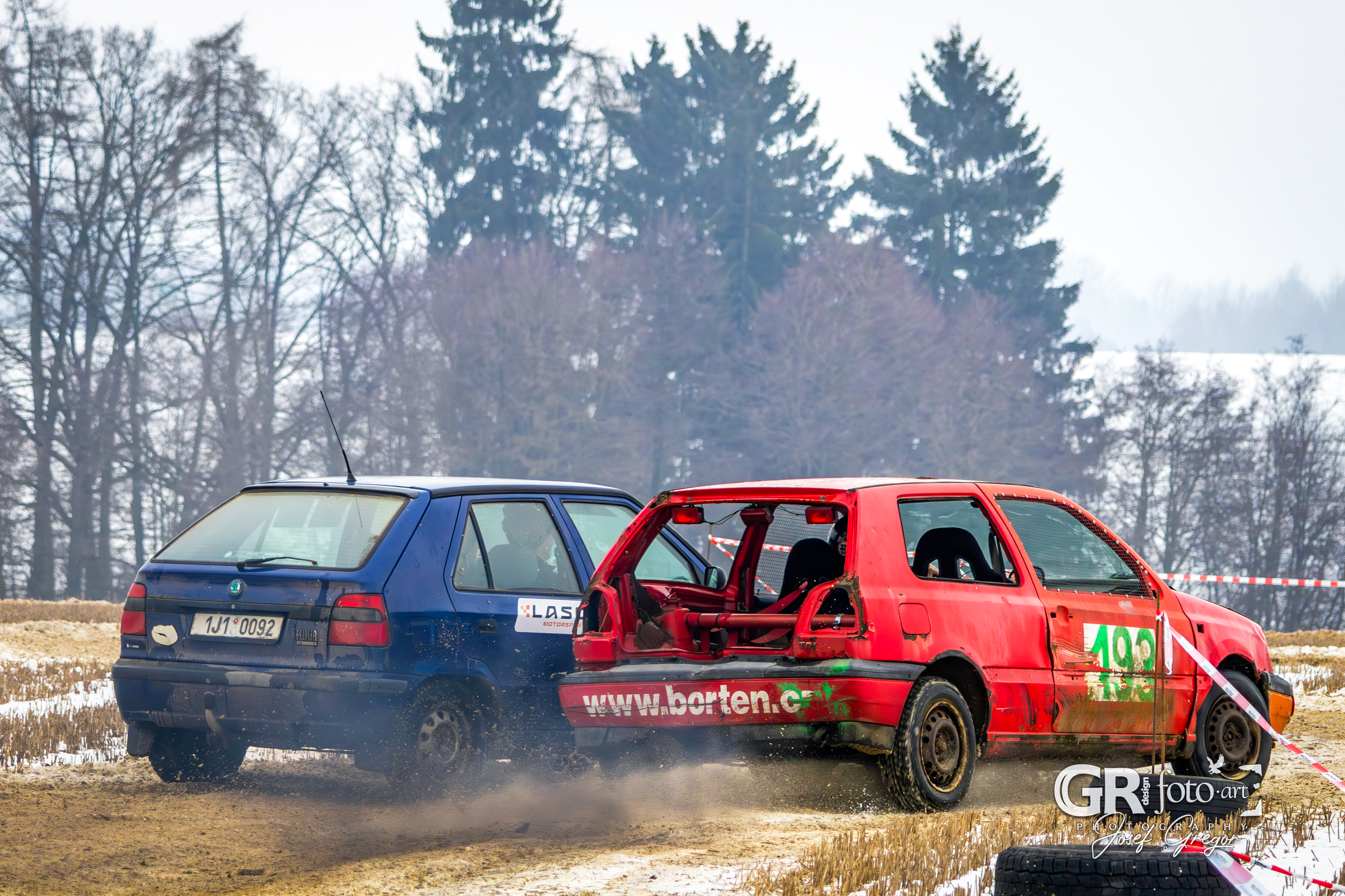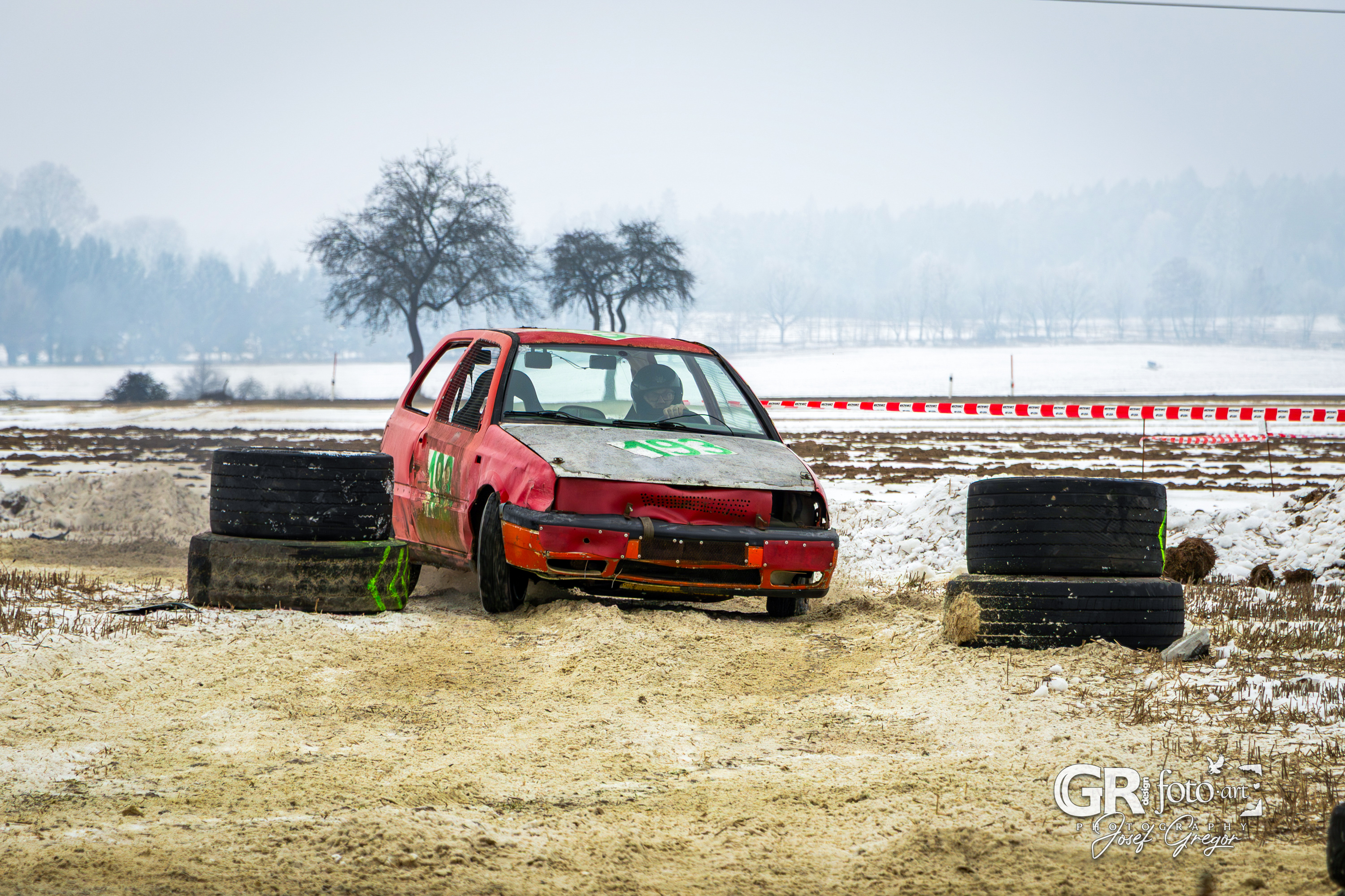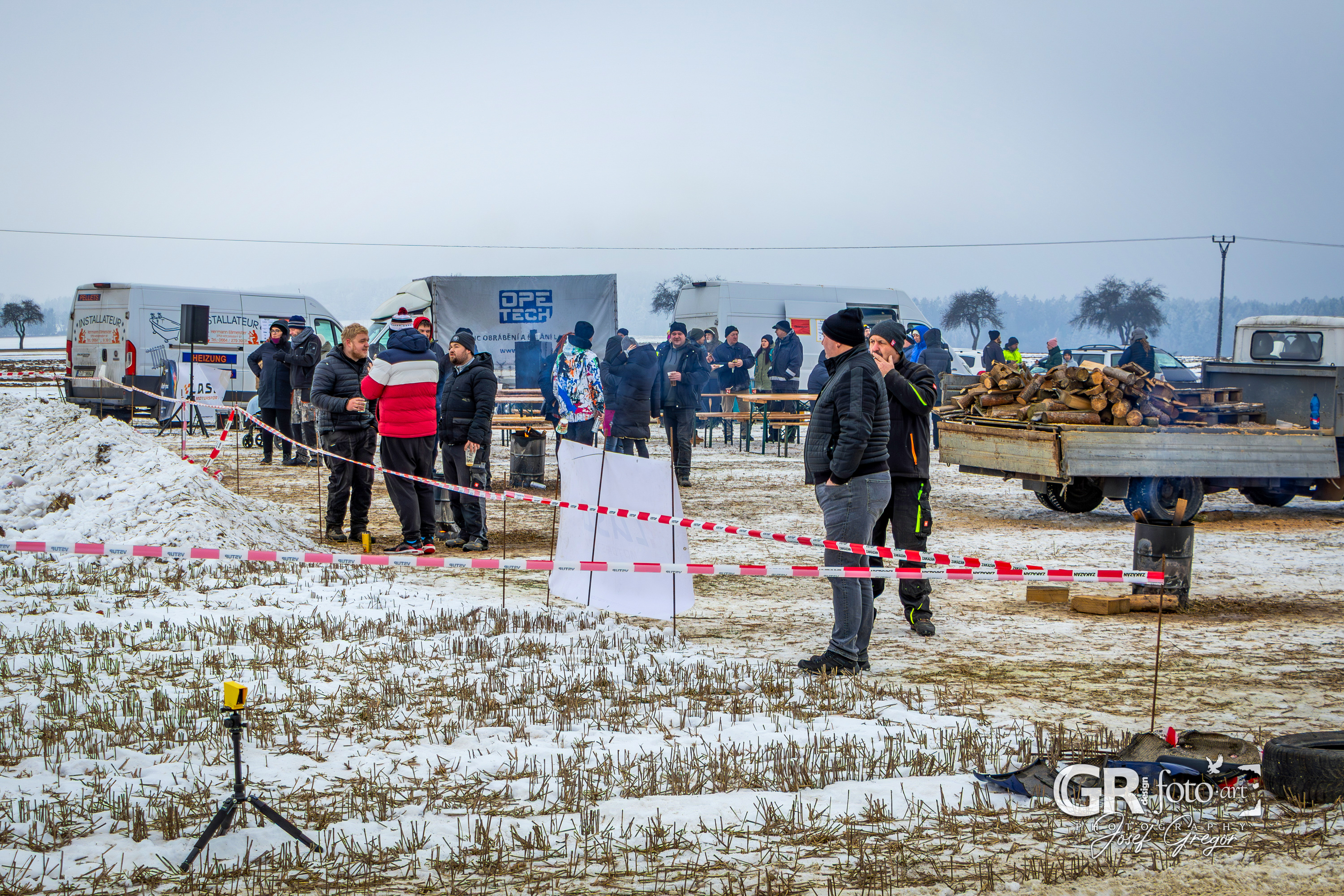 První měřené rozjížďky začaly kolem půl desáté, kdy bylo startovní pole ještě plné. Jenže co by člověk nechtěl – zrovna v sobotu, kdy se akce konala, jsem měl službu v práci. Na místo jsem se tak dostal až kolem poledne, což už znamenalo spoustu odpadlých závodníků a výrazně prořídlé startovní pole. Ono se není čemu divit. Akce se konala na nezoraném, ale úplně zmrzlém poli, jen s tenkou vrstvou sněhu. Kameny a hlubší nerovnosti tak způsobovaly brutální likvidaci aut a upřímně se divím, že se někdo odvážil vjet na trať i s vozem, se kterým pak plánoval odjet domů. A trochu mi to spíš připadalo jako bezkontaktní demoliční derby, protože aut stavěných na takový povrch se v závodním poli skutečně moc nenašlo. V každém případě to pro mě bohužel znamenalo fotit už jen zbytky přeživších.