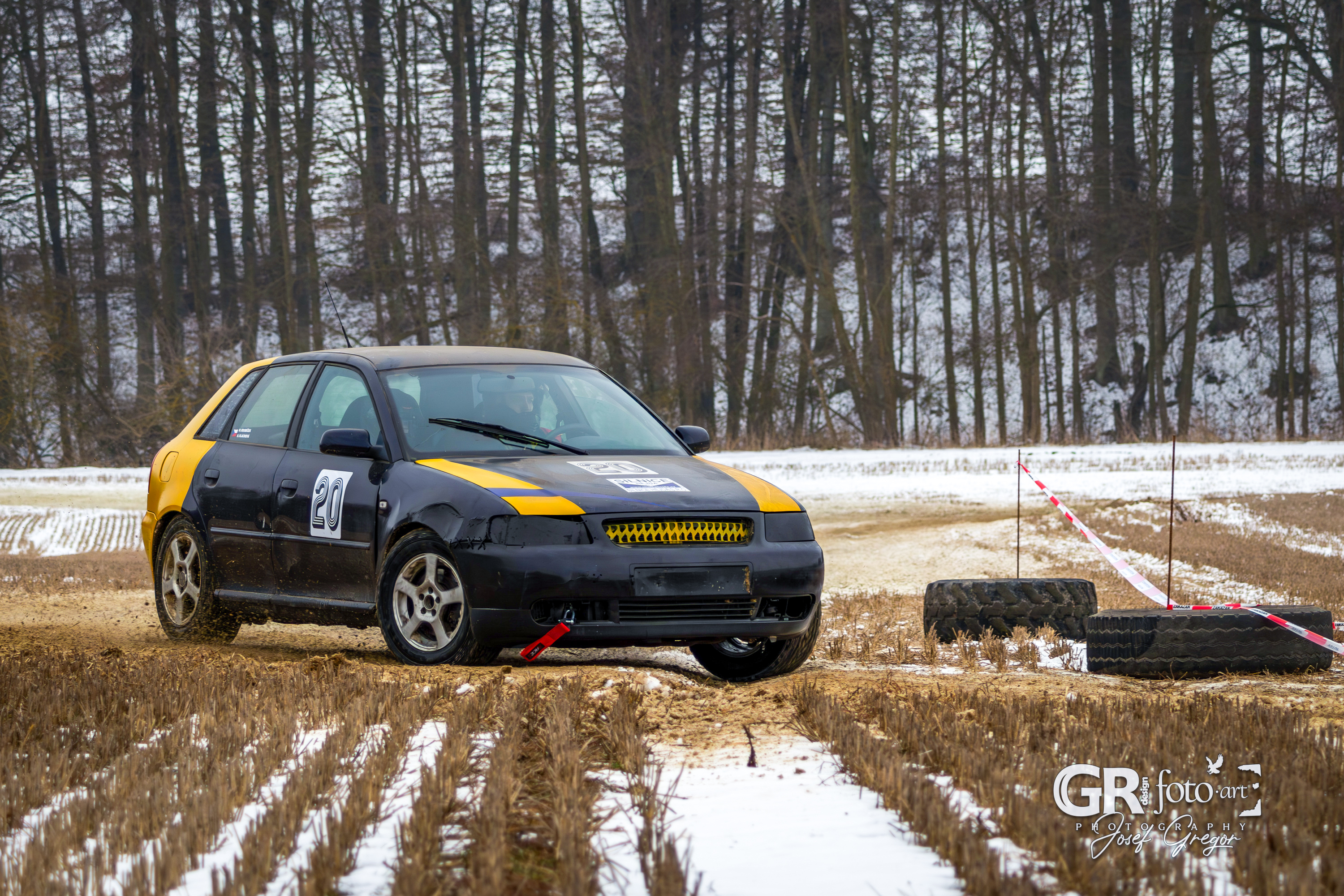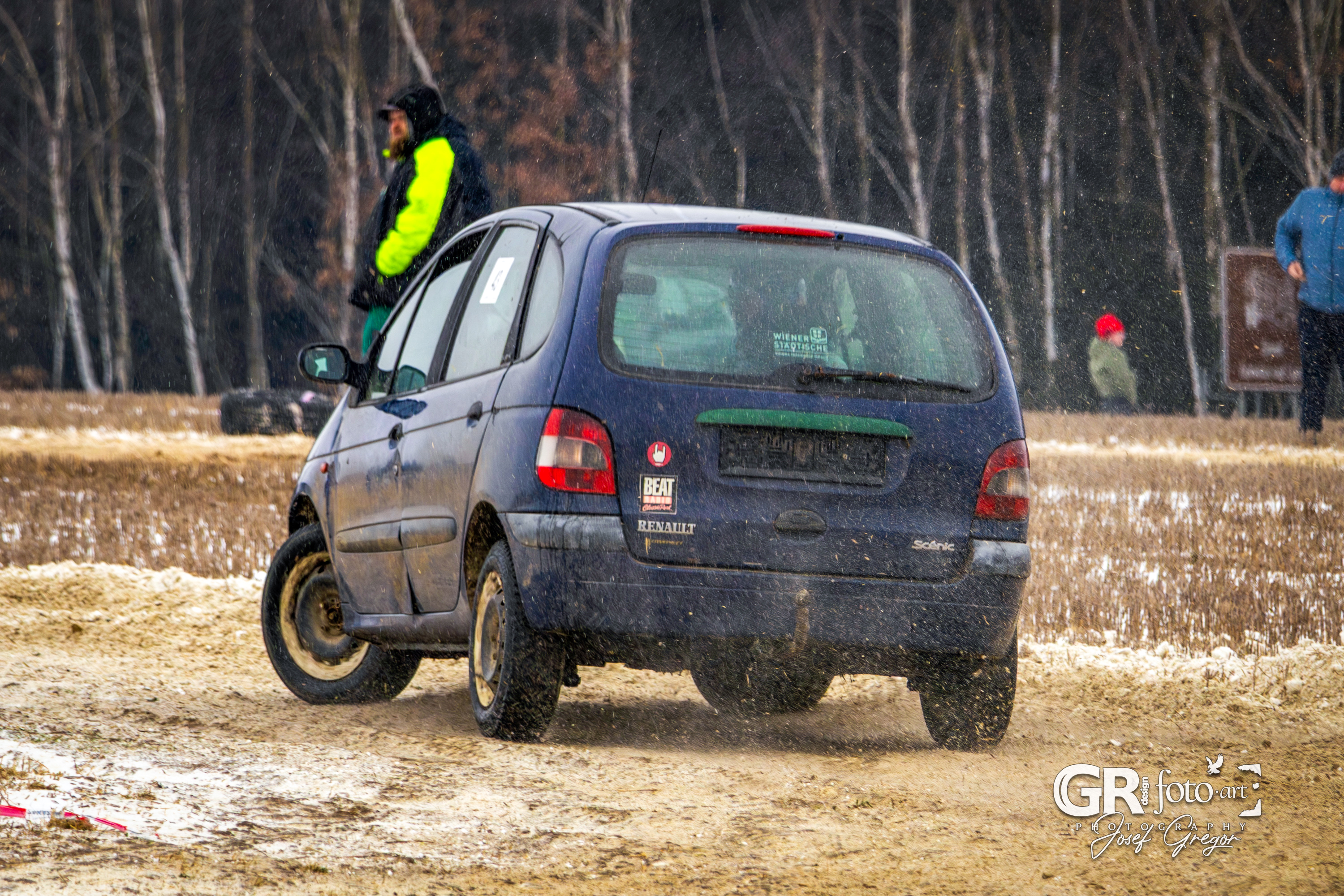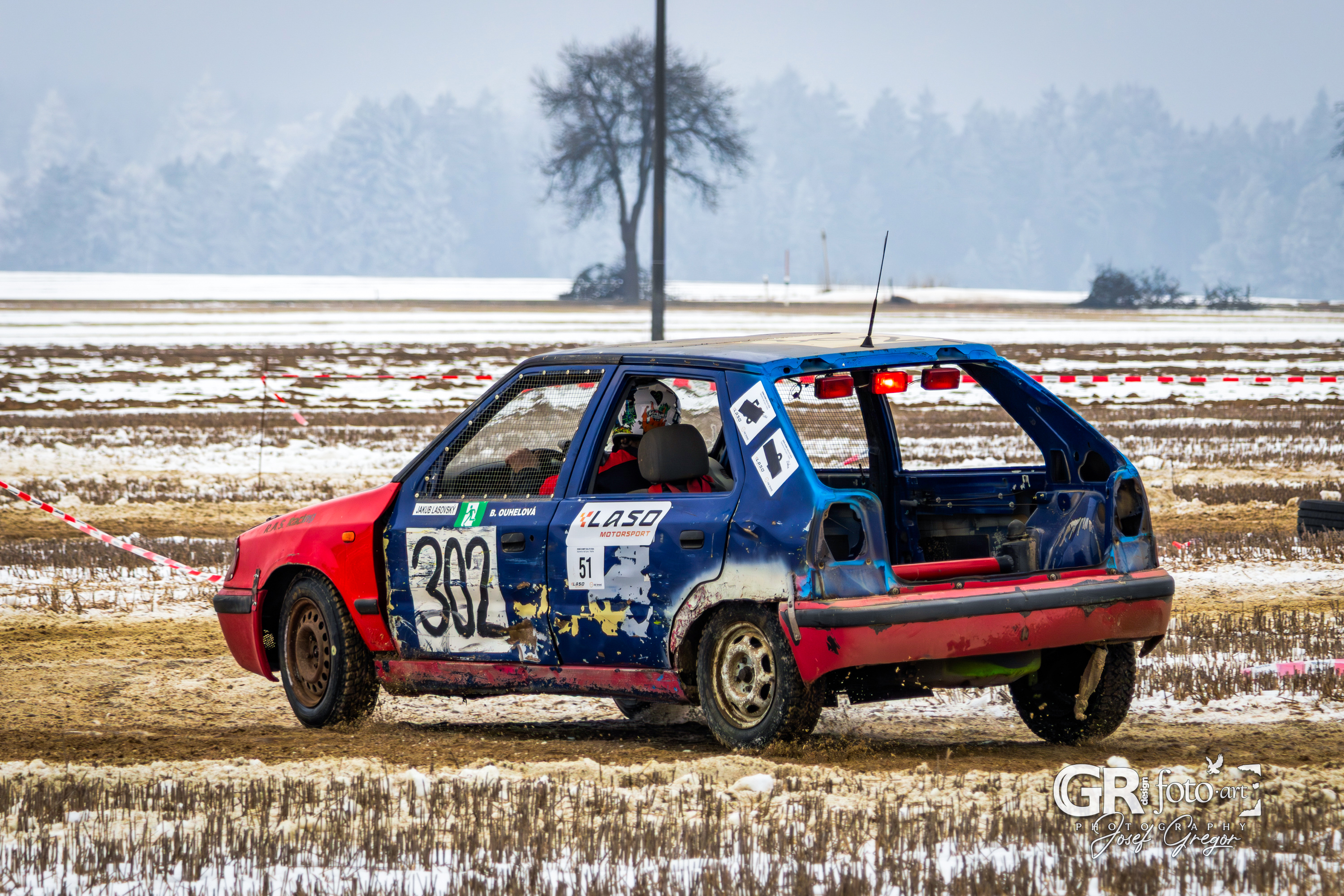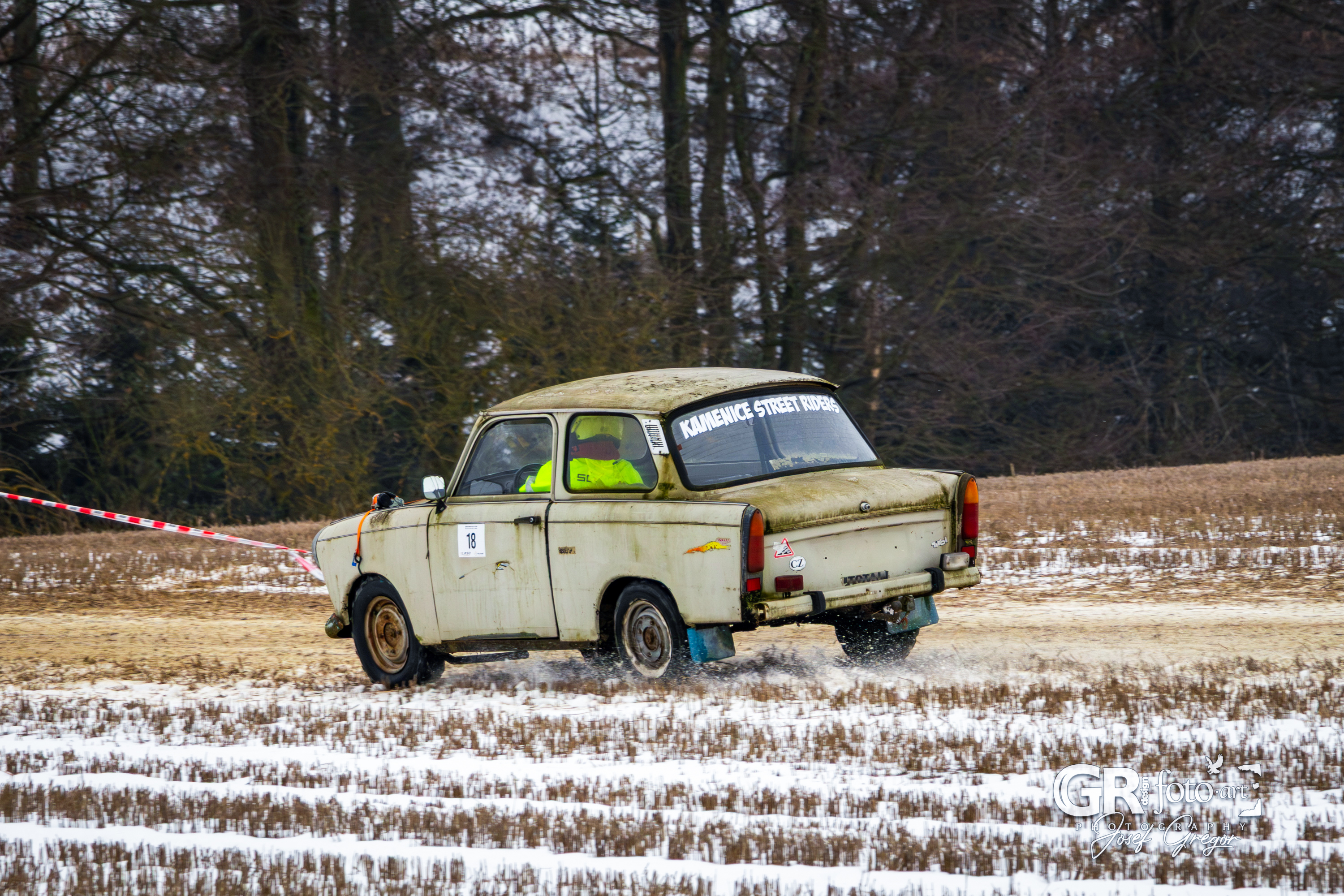 První měřené rozjížďky začaly kolem půl desáté, kdy bylo startovní pole ještě plné. Jenže co by člověk nechtěl – zrovna v sobotu, kdy se akce konala, jsem měl službu v práci. Na místo jsem se tak dostal až kolem poledne, což už znamenalo spoustu odpadlých závodníků a výrazně prořídlé startovní pole. Ono se není čemu divit. Akce se konala na nezoraném, ale úplně zmrzlém poli, jen s tenkou vrstvou sněhu. Kameny a hlubší nerovnosti tak způsobovaly brutální likvidaci aut a upřímně se divím, že se někdo odvážil vjet na trať i s vozem, se kterým pak plánoval odjet domů. A trochu mi to spíš připadalo jako bezkontaktní demoliční derby, protože aut stavěných na takový povrch se v závodním poli skutečně moc nenašlo. V každém případě to pro mě bohužel znamenalo fotit už jen zbytky přeživších.