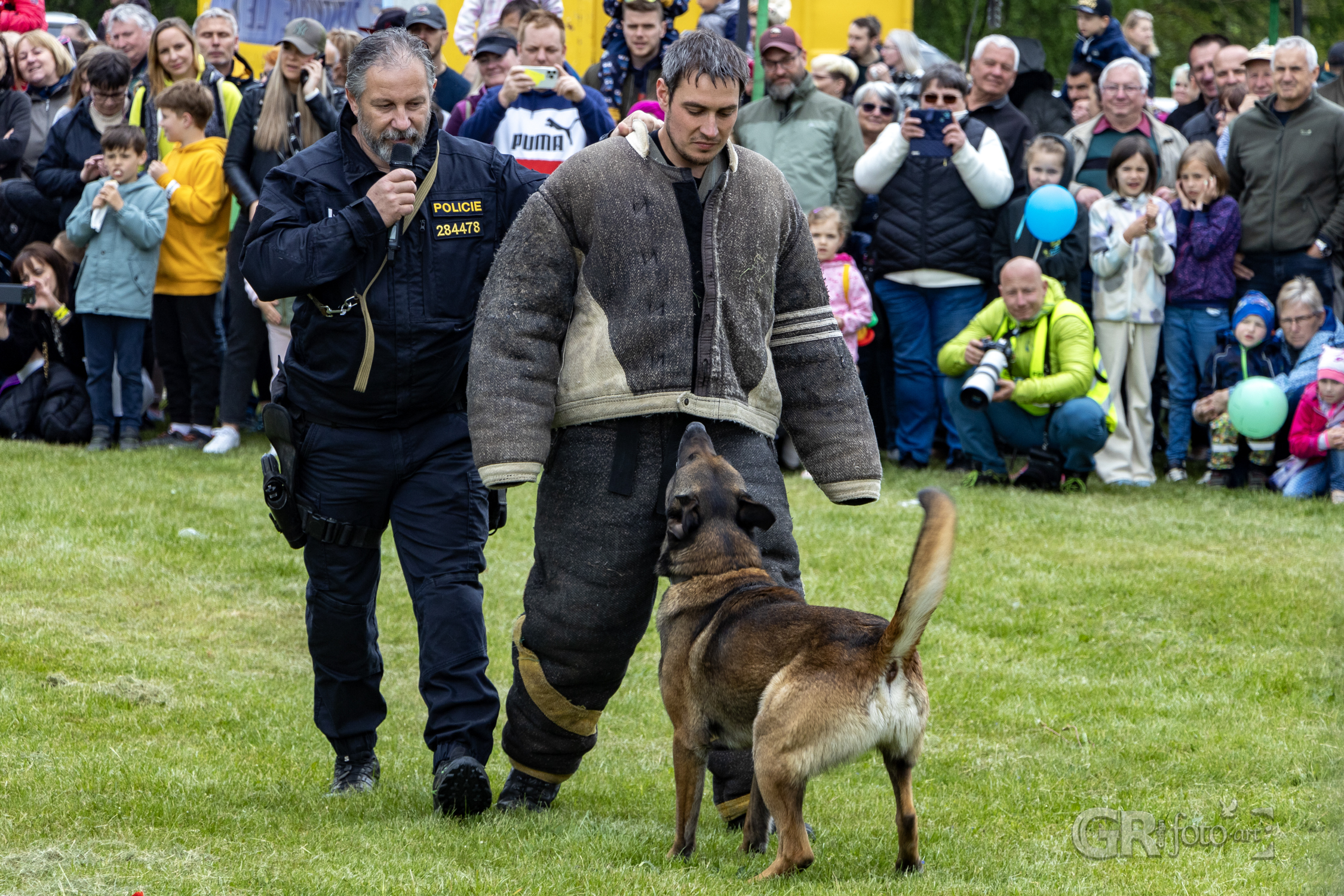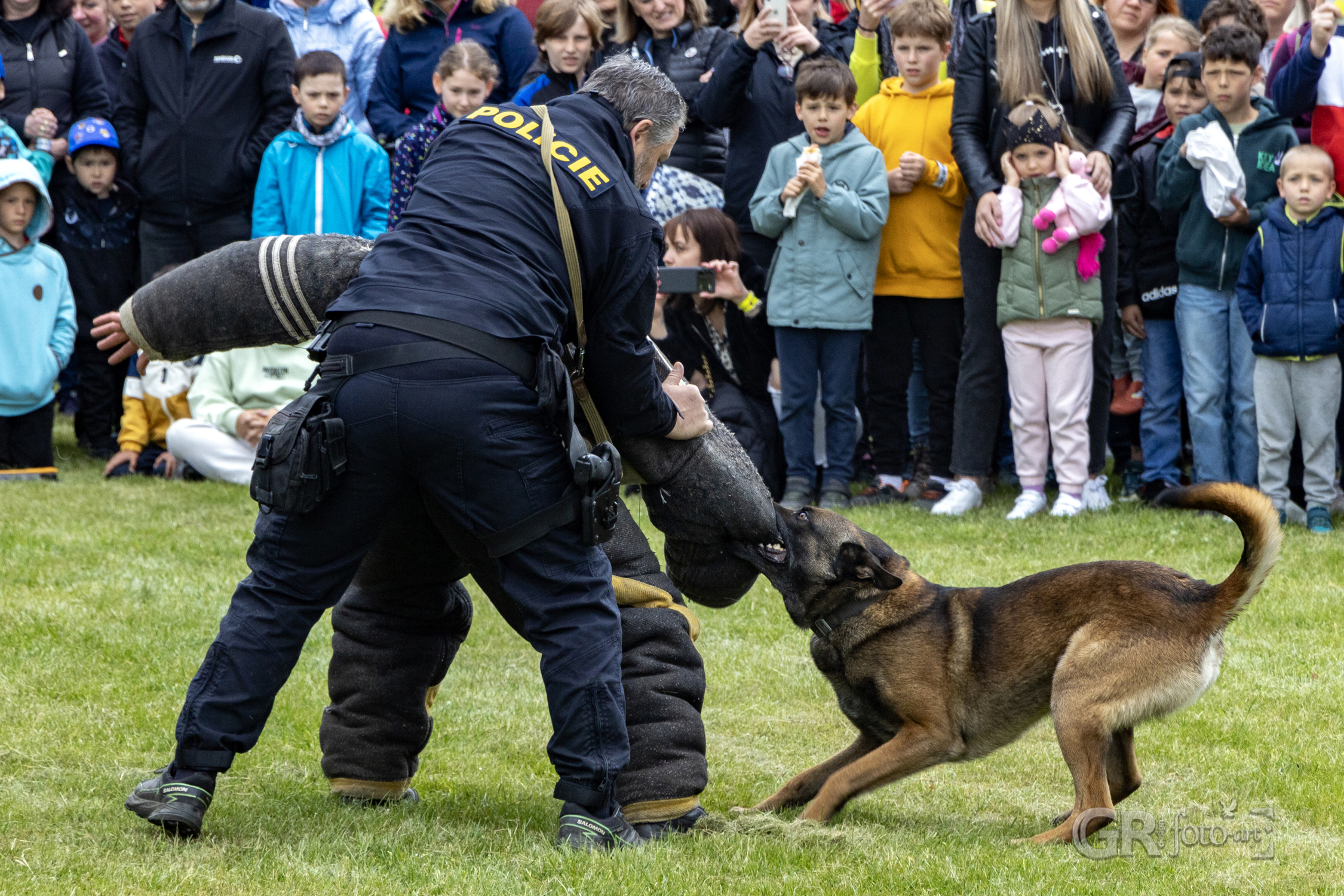 Následovala ukázka práce policejního psa a jeho psovoda. Poslušnost, pohotovost, zadržení pachatele – v podání čtyřnohého profesionála to byla ukázka síly, disciplíny a důvěry. Bylo i vidět, že si zásah na agresora maximálně užíval.