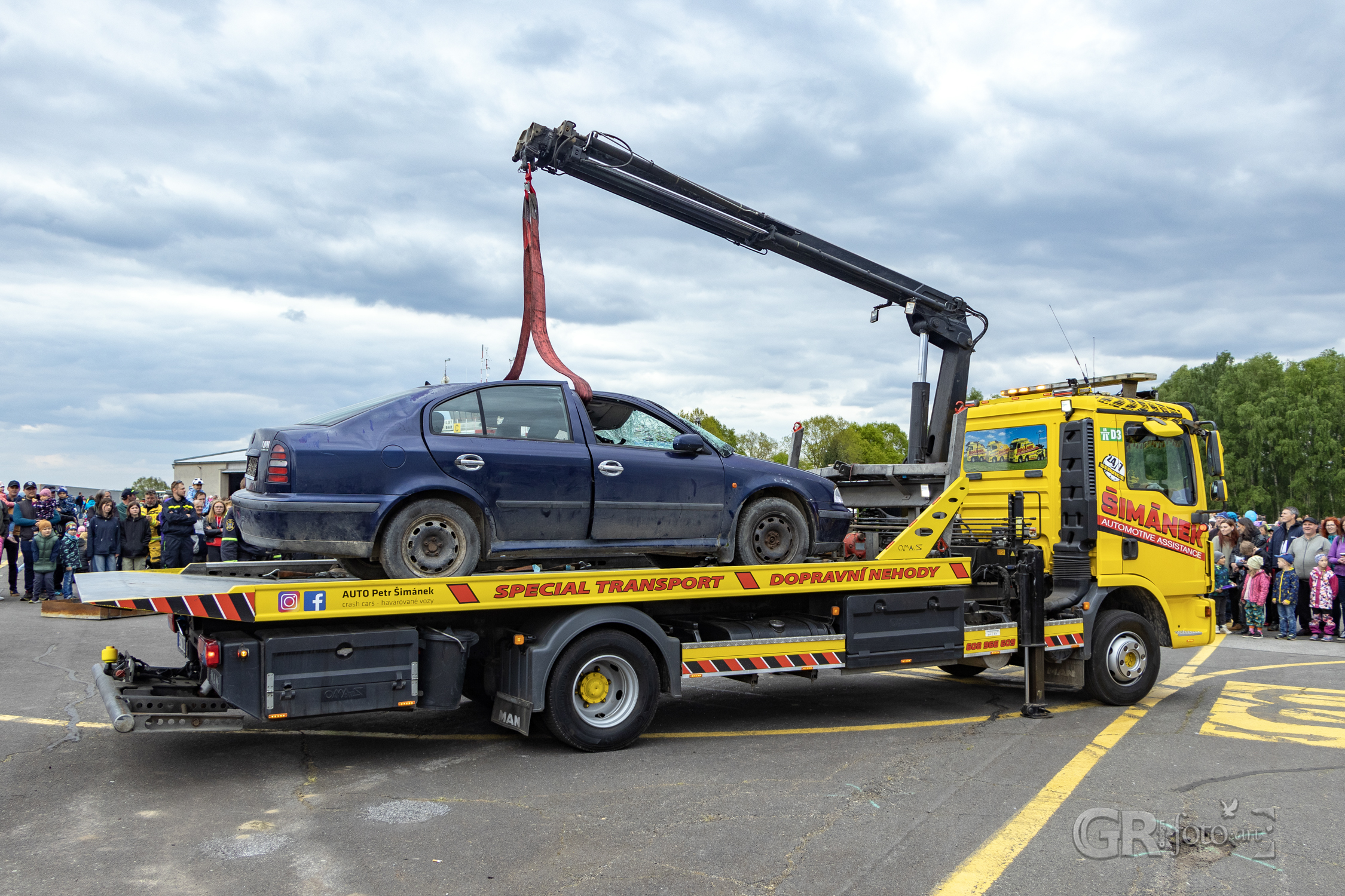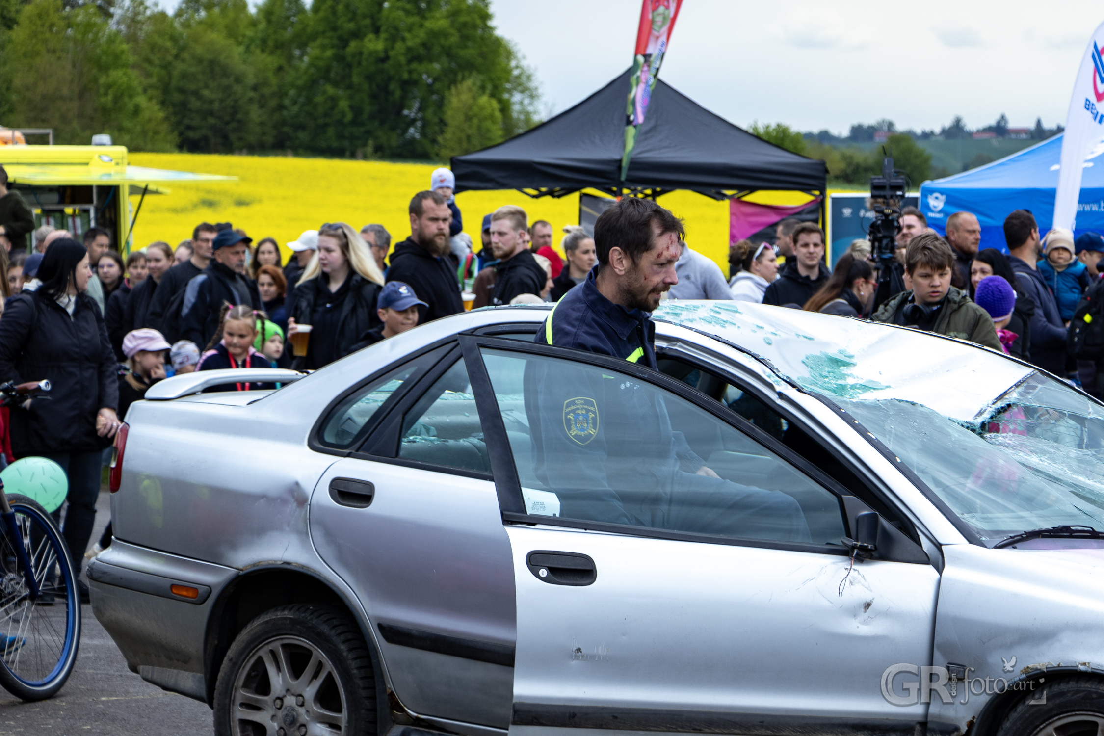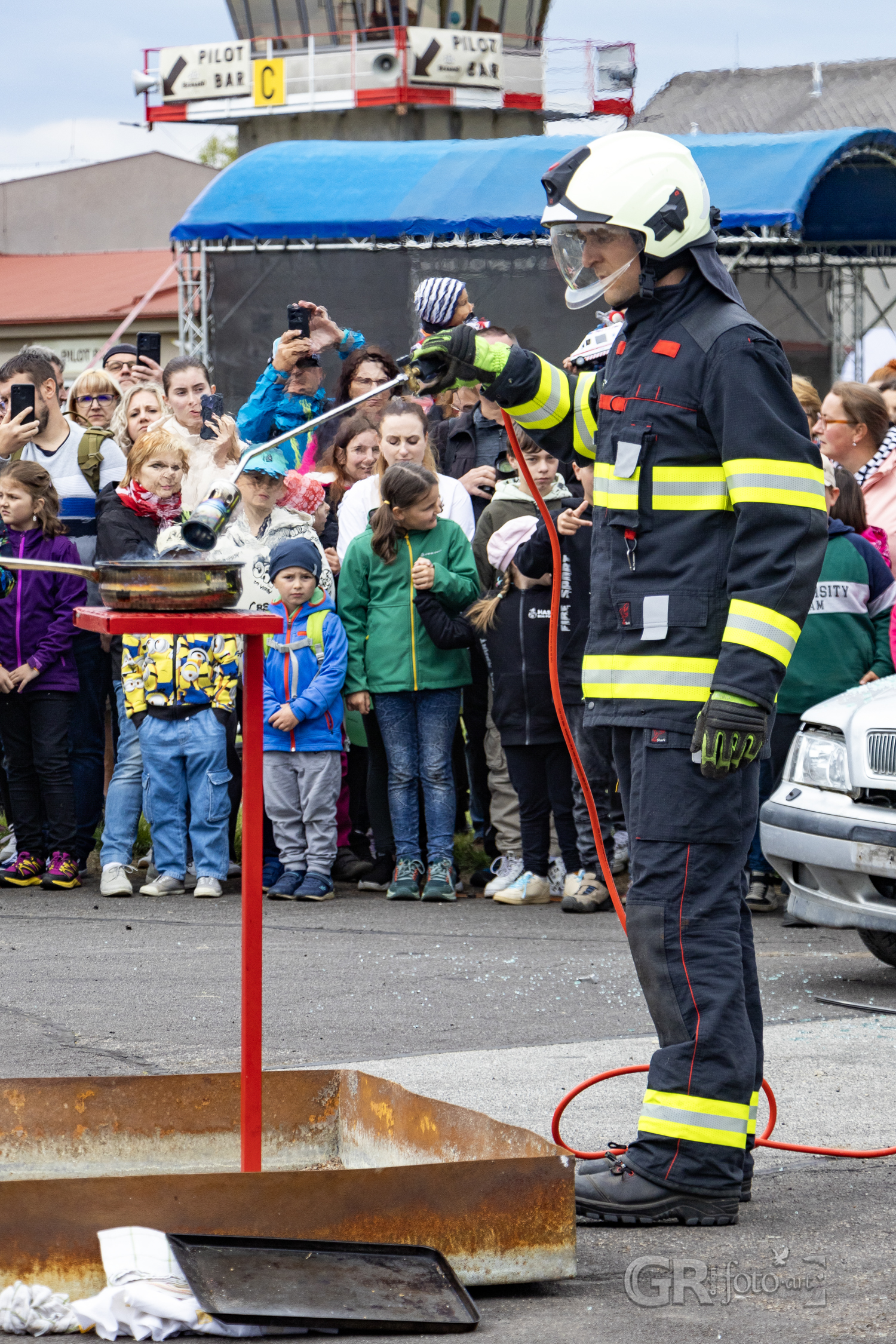 Po zásahu se pozornost přesunula ke zbývajícímu autu – převrácení na kola, naložení na vůz. Rutina, která ukončila jednu kapitolu dne. Na stejném místě už se ale připravovala další ukázka – hašení hořícího oleje. Hasiči názorně ukázali, co (ne) dělat, když v kuchyni vzplane pánev. Jaký je rozdíl mezi přikrytím utěrkou, použití kuchyňského plechu a použitím vody? Ten třetí scénář přišel nakonec – a plameny vybuchly do výšky v dramatickém výjevu, který si diváci jistě zapamatují.