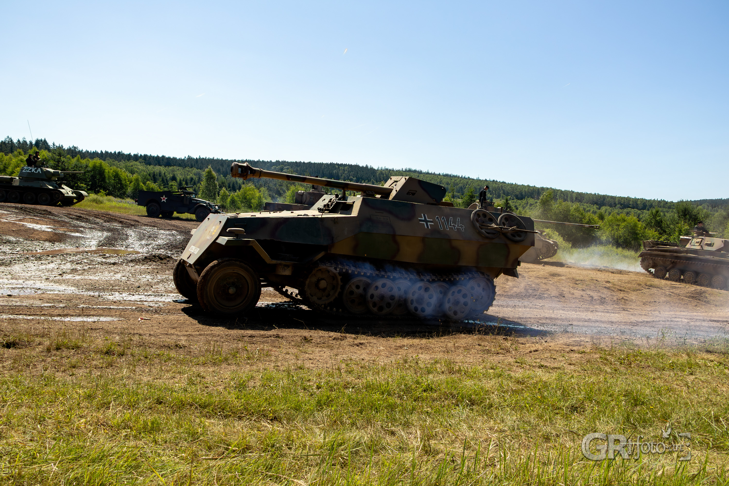 A pak už to jelo. Historické tanky, zaparkované před podiem, se vydaly na cestu kolem polygonu. Tahle část byla skvěle zorganizovaná. Divácký prostor měřil přes 400 metrů a všechna vozidla projížděla těsně kolem lidí. A aby si je každý opravdu stačil prohlédnout, objížděla trasu několikrát. K vidění byly tanky sovětské produkce jako T-34/85 nebo IS, ale i německé kusy jako Tiger či Hetzer. Nechci vypisovat všechny — nejsem takový znalec.