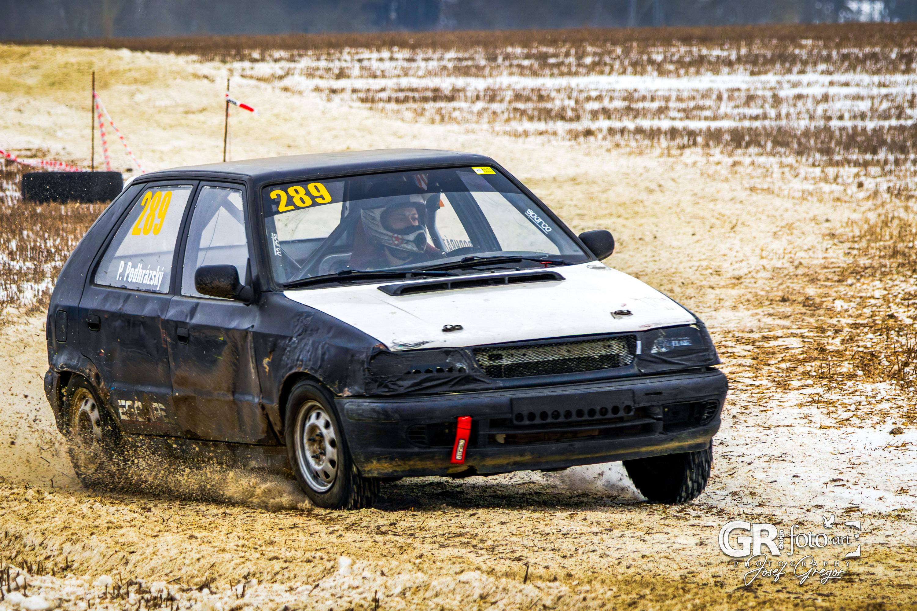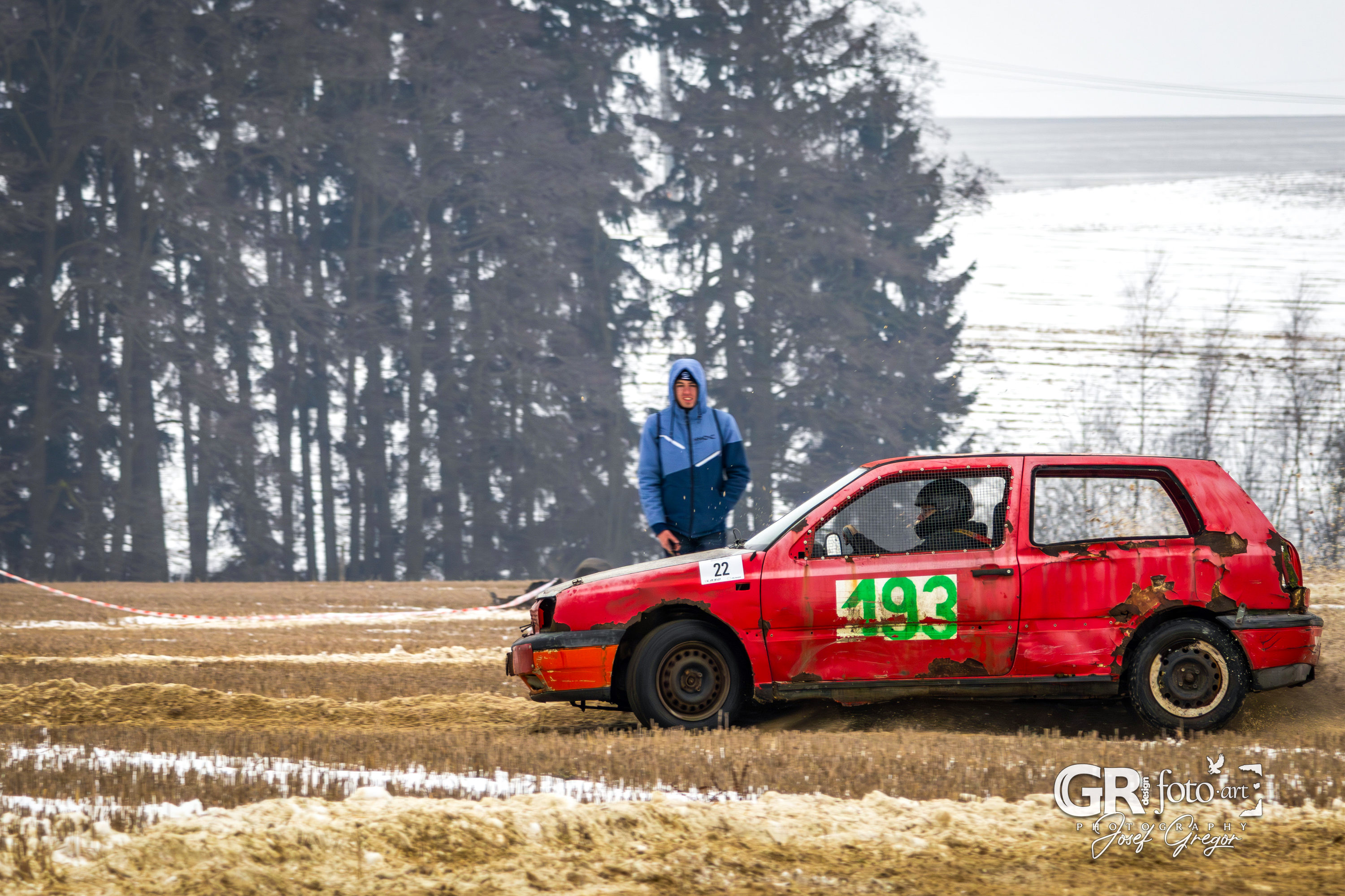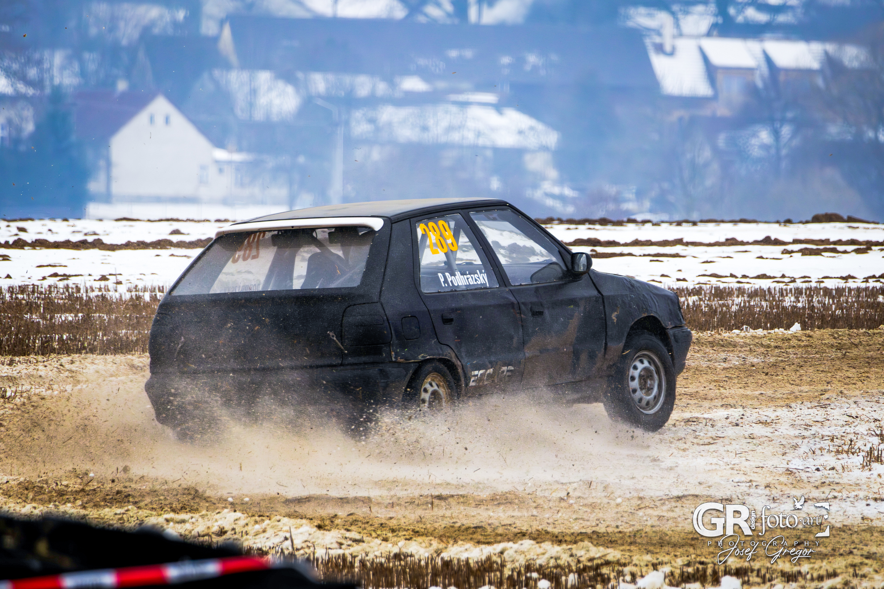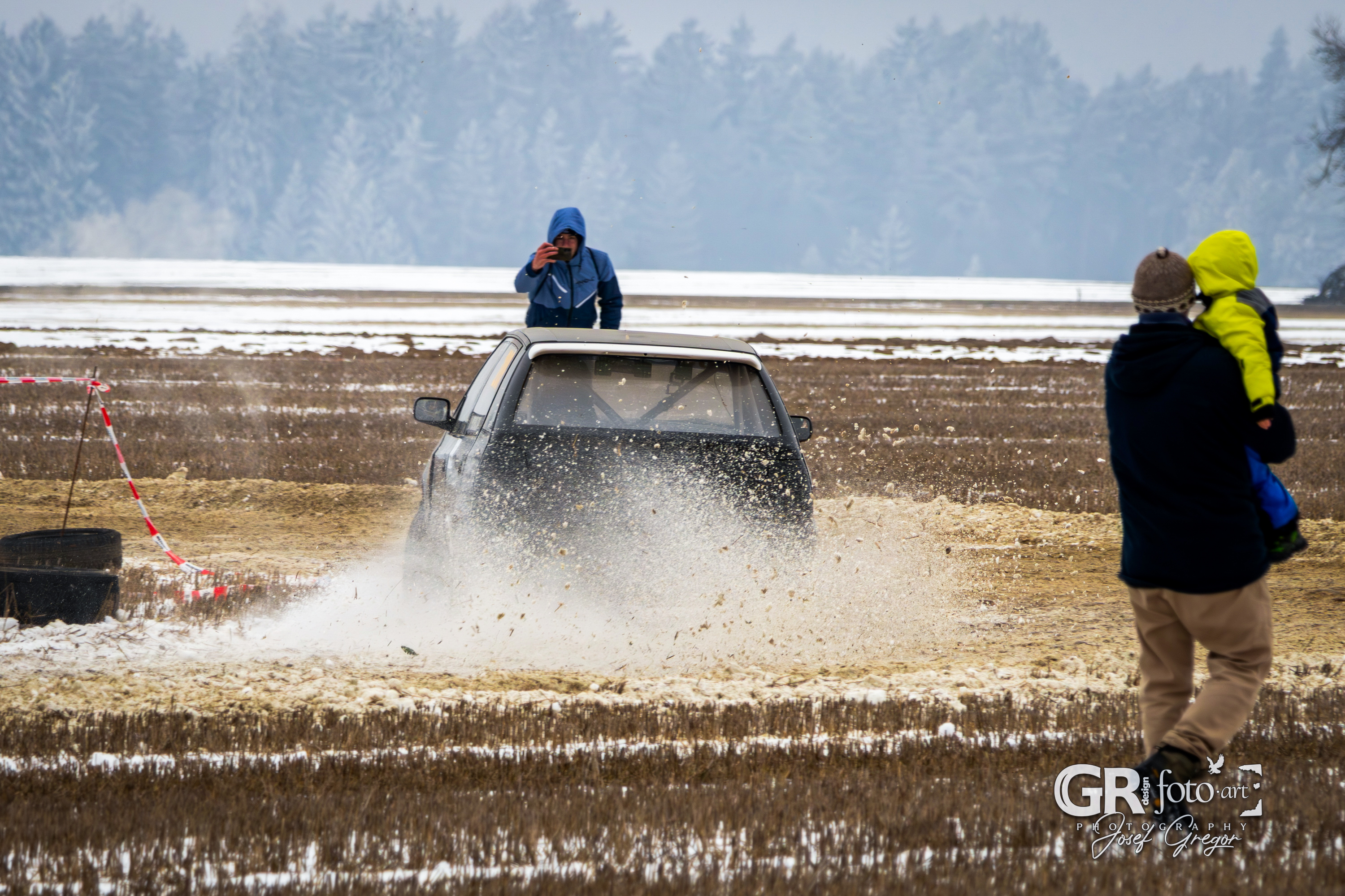 První měřené rozjížďky začaly kolem půl desáté, kdy bylo startovní pole ještě plné. Jenže co by člověk nechtěl – zrovna v sobotu, kdy se akce konala, jsem měl službu v práci. Na místo jsem se tak dostal až kolem poledne, což už znamenalo spoustu odpadlých závodníků a výrazně prořídlé startovní pole. Ono se není čemu divit. Akce se konala na nezoraném, ale úplně zmrzlém poli, jen s tenkou vrstvou sněhu. Kameny a hlubší nerovnosti tak způsobovaly brutální likvidaci aut a upřímně se divím, že se někdo odvážil vjet na trať i s vozem, se kterým pak plánoval odjet domů. A trochu mi to spíš připadalo jako bezkontaktní demoliční derby, protože aut stavěných na takový povrch se v závodním poli skutečně moc nenašlo. V každém případě to pro mě bohužel znamenalo fotit už jen zbytky přeživších.